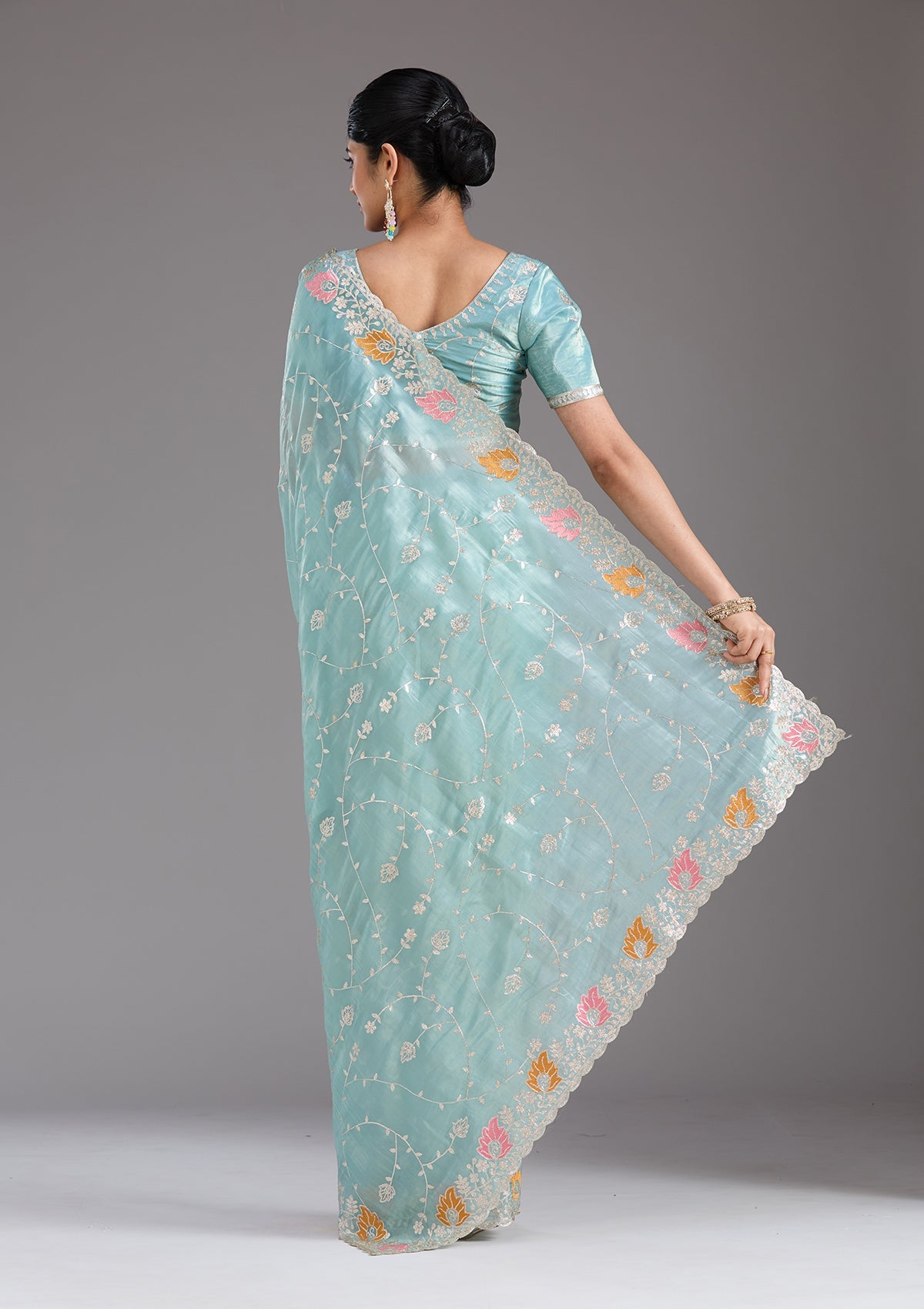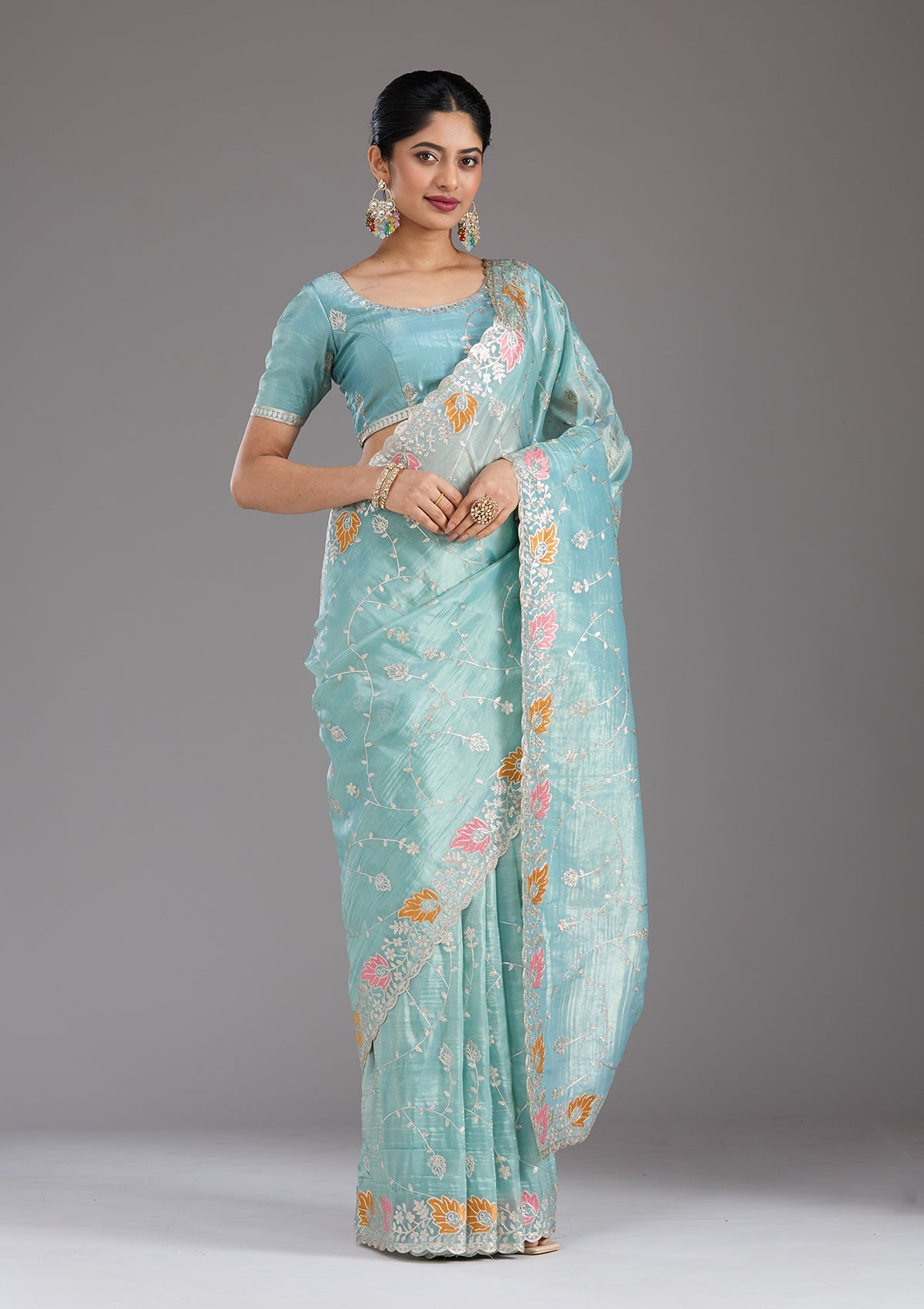 Sea Green Saree in Organza fabric. The Saree is elevated with Gotapatti embroidery. It comes with an Unstitched blouse. Comes with the Koskii promise of premium quality.