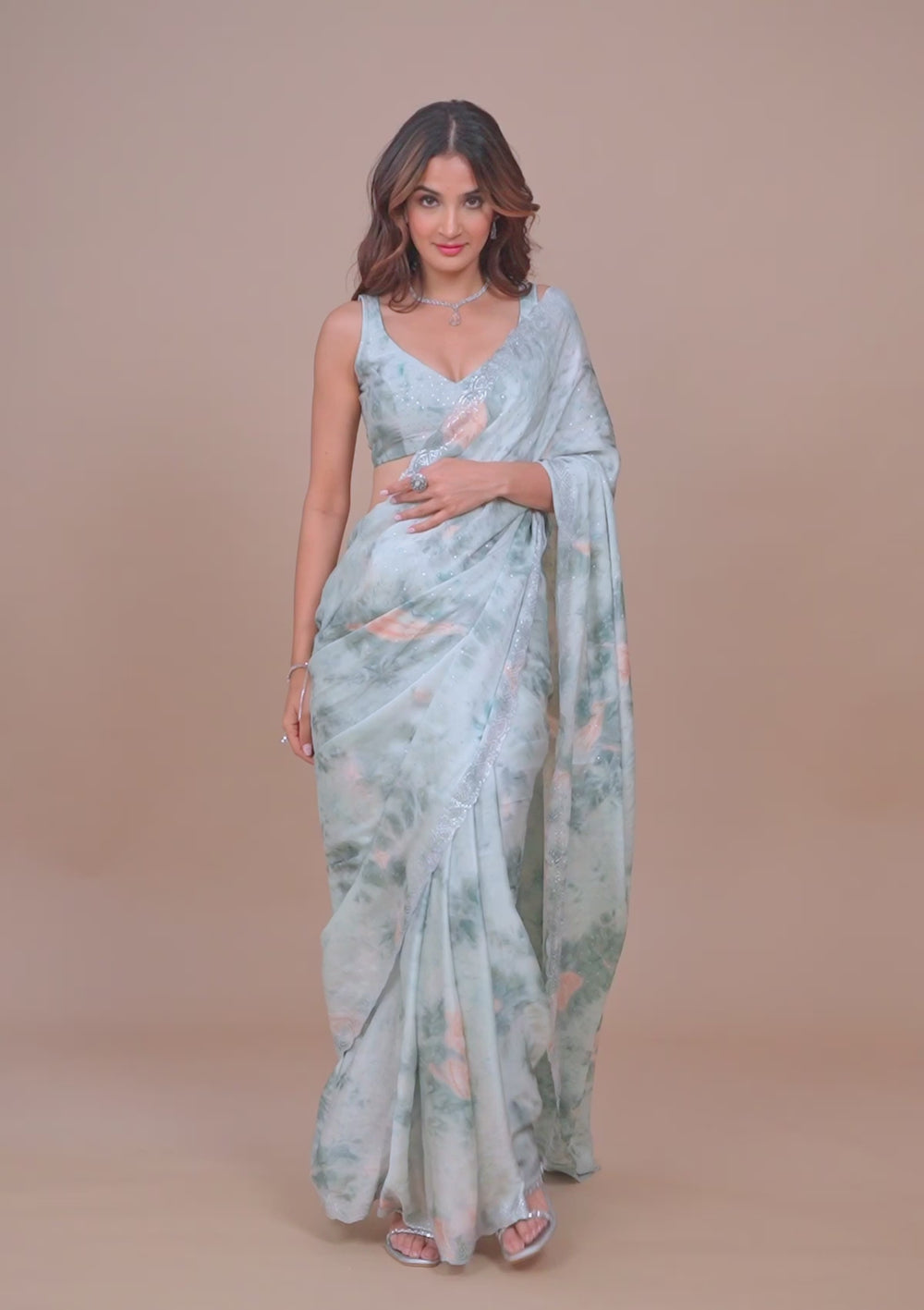 Sea Green Saree in Satin fabric. The Saree is elevated with Printed embroidery. It comes with an Unstitched blouse. Comes with the Koskii promise of premium quality.