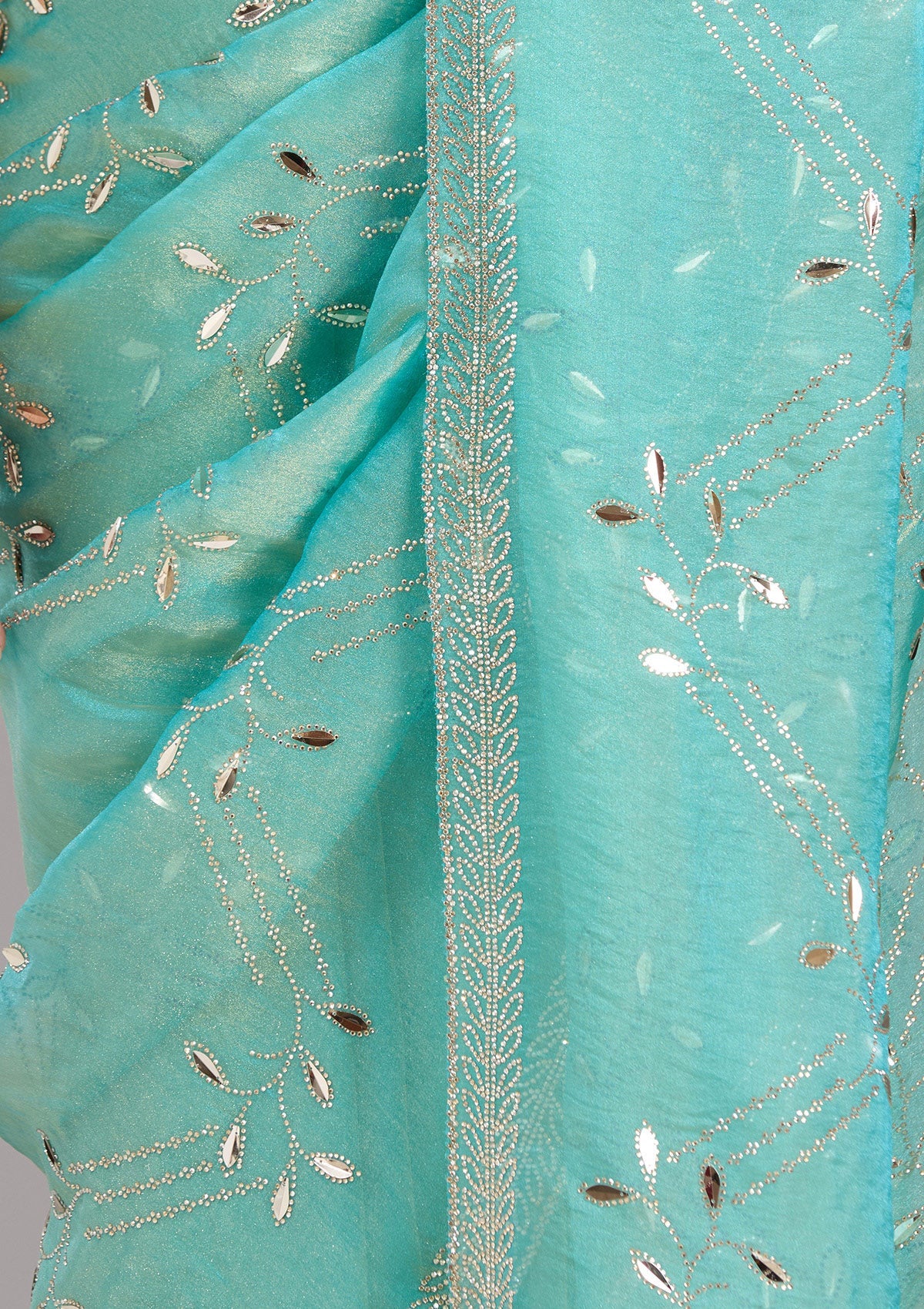 Sea Green Saree in Tissue fabric The Saree is elevated with Stonework (Gold) embroidery It comes with an Unstitched blouse Comes with the Koskii promise of premium quality.