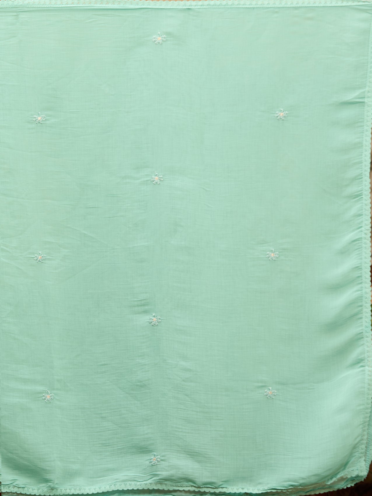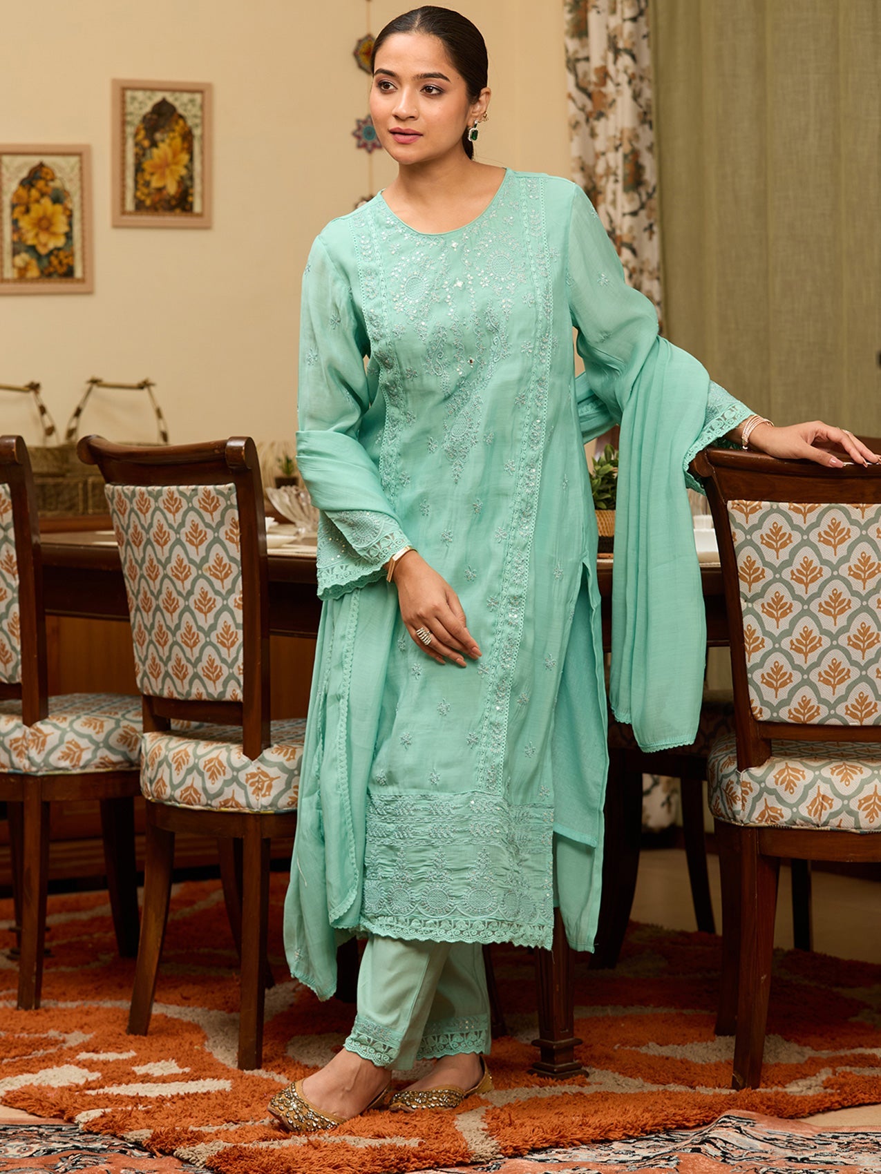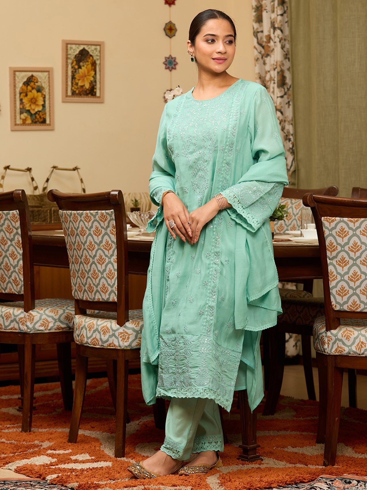 Sea Green Salwar Suit in Chanderi fabric. The Salwar Suit is embellished with Threadwork embroidery. Accompanied with a bottom and dupatta. Comes with the Koskii promise of premium quality.