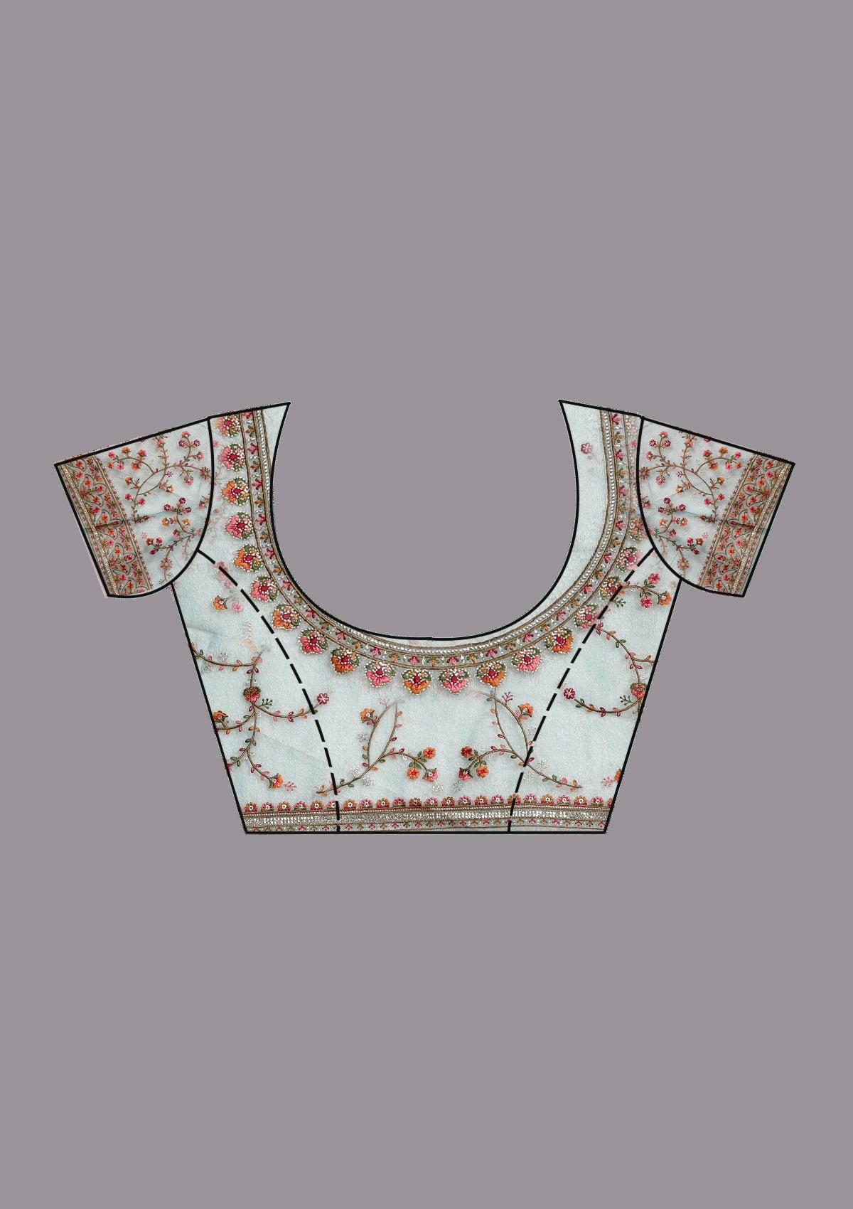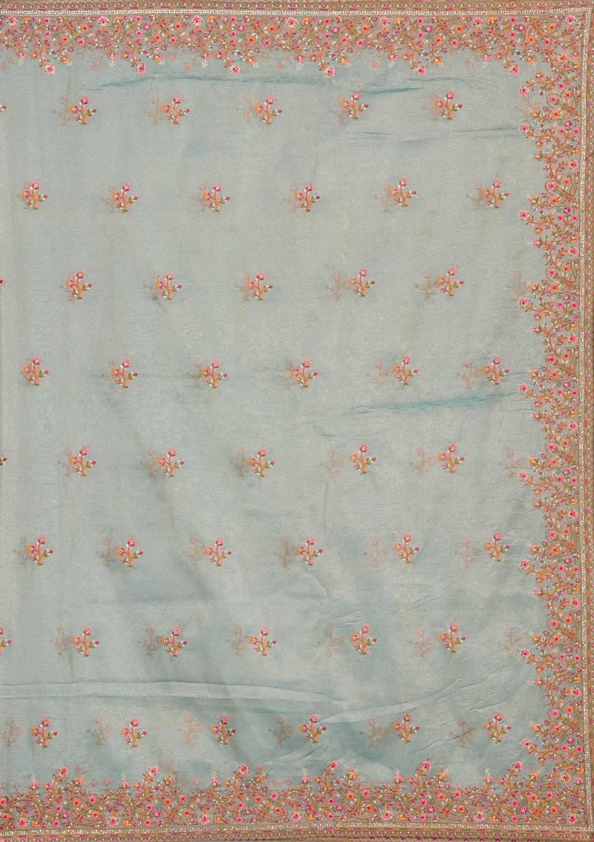 Sea Green Saree in Tissue fabric. The Saree is elevated with Threadwork embroidery. It comes with an Unstitched blouse. Comes with the Koskii promise of premium quality.