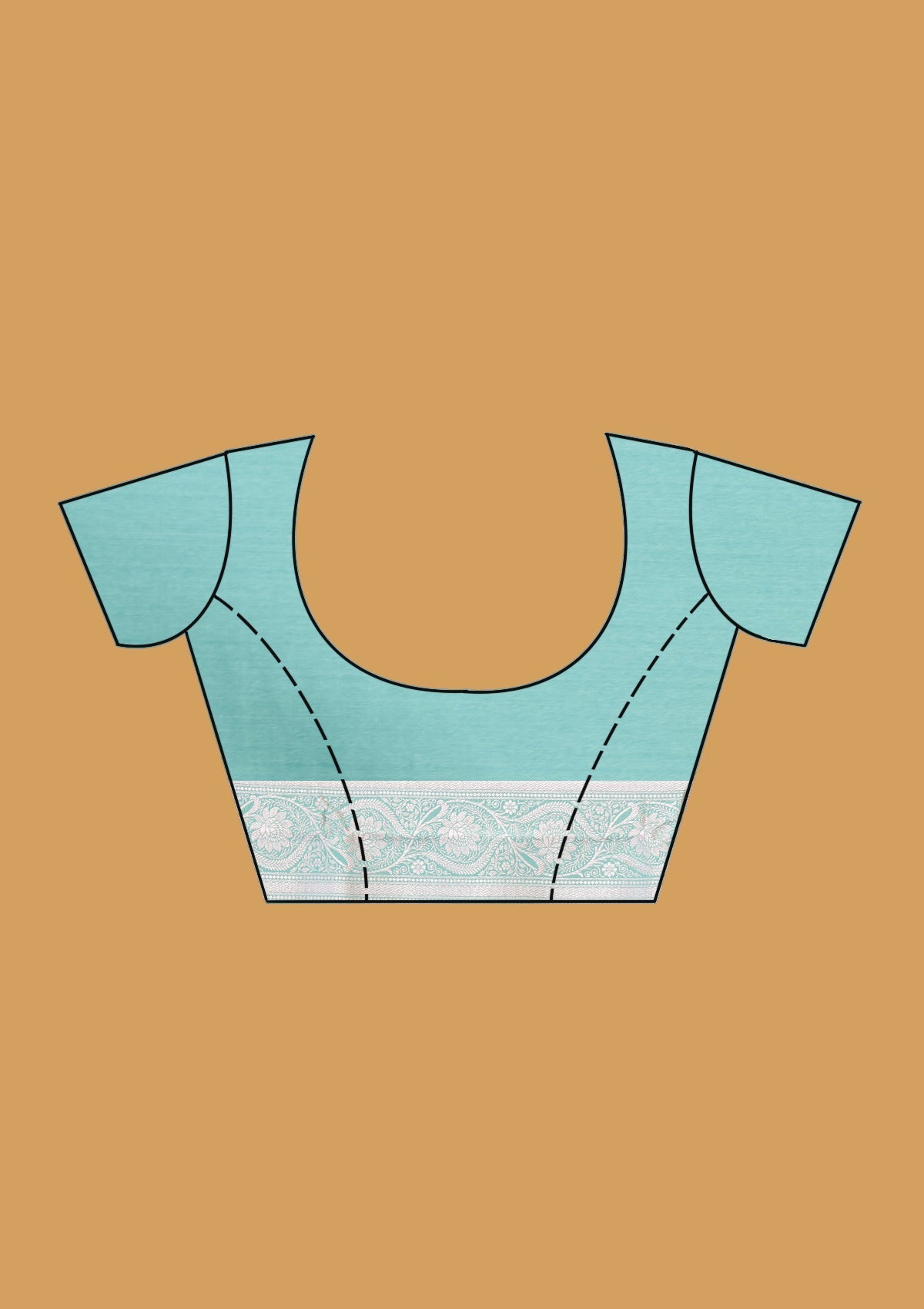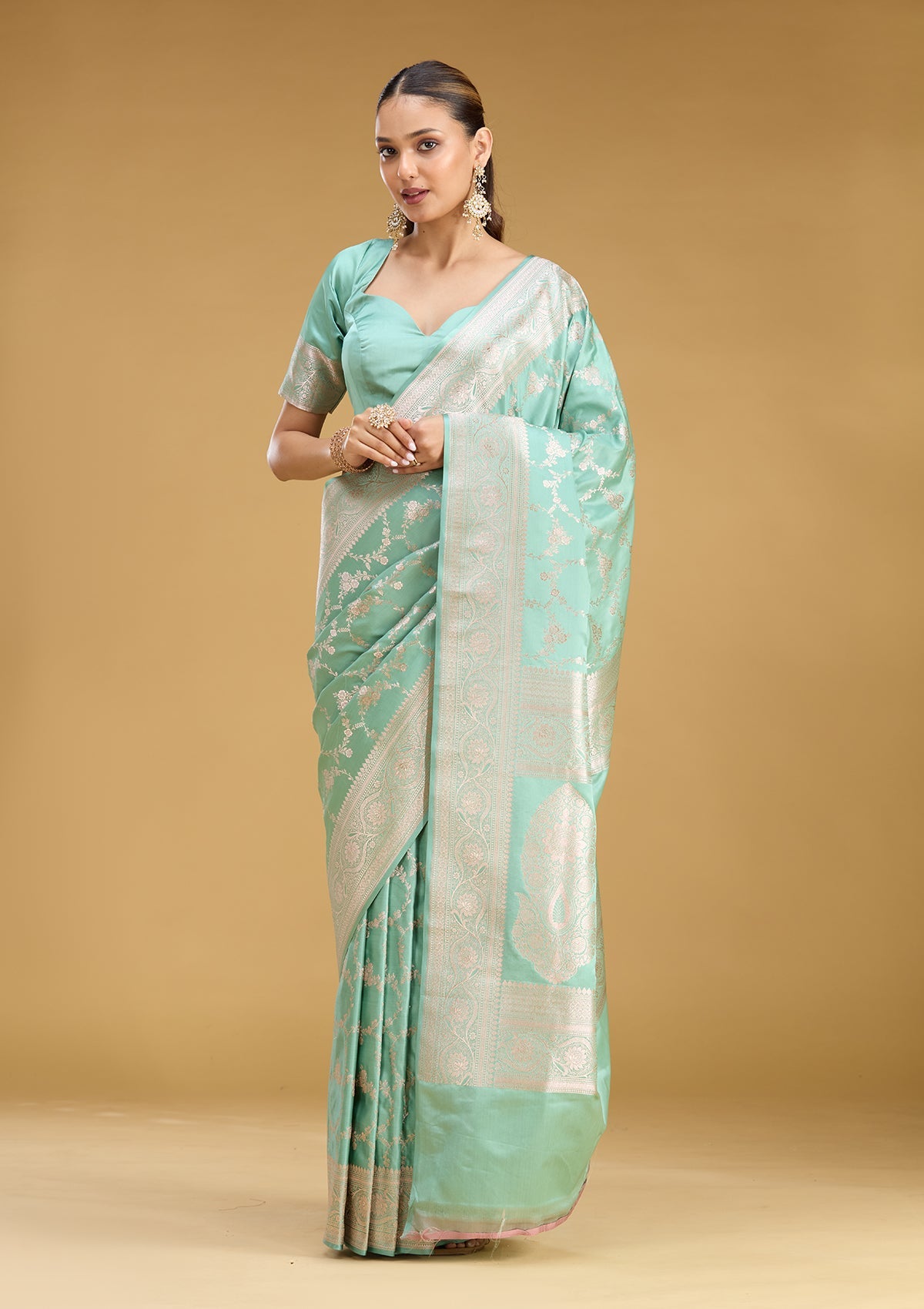 Sea Green Silk_Saree in Art Silk fabric. The Silk_Saree is elevated with Zariwork (Gold) embroidery. It comes with an Unstitched blouse. Comes with the Koskii promise of premium quality.