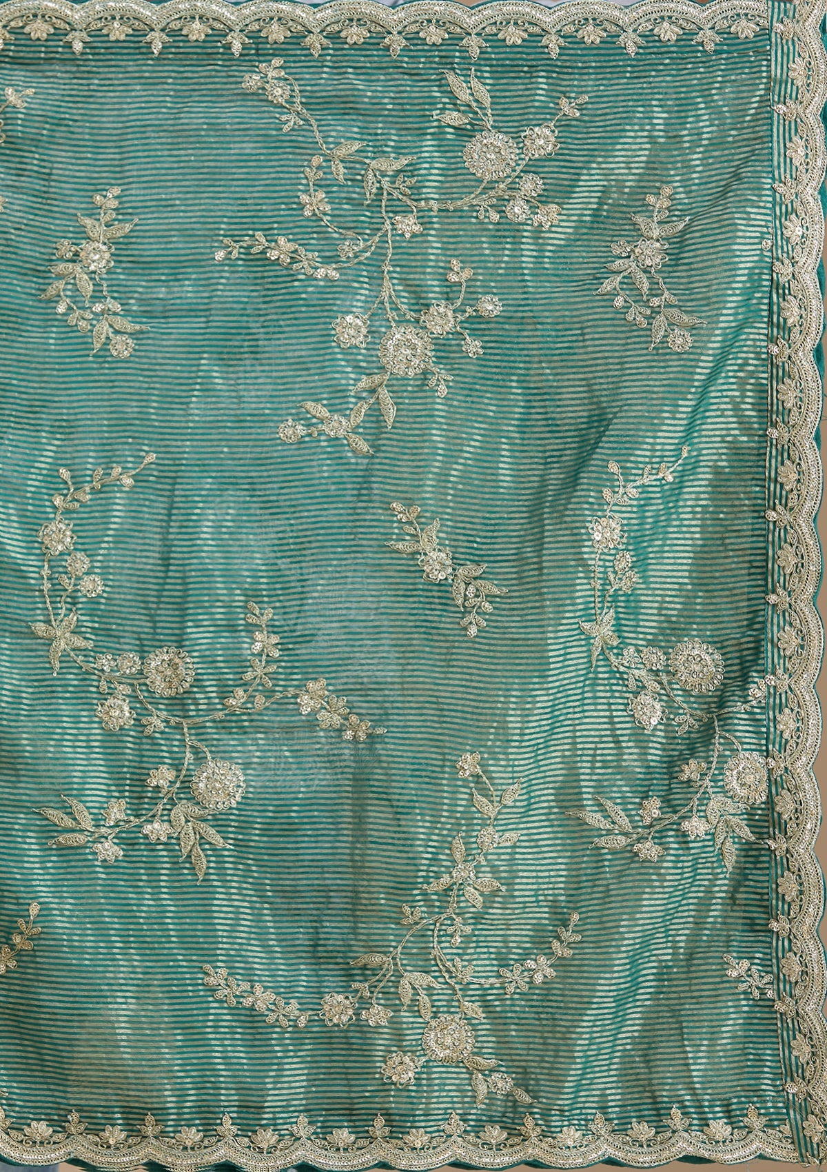 Sea Green Salwar Suit in Tissue fabric. The Salwar Suit is embellished with Zariwork embroidery. Accompanied with a bottom and dupatta. Comes with the Koskii promise of premium quality.