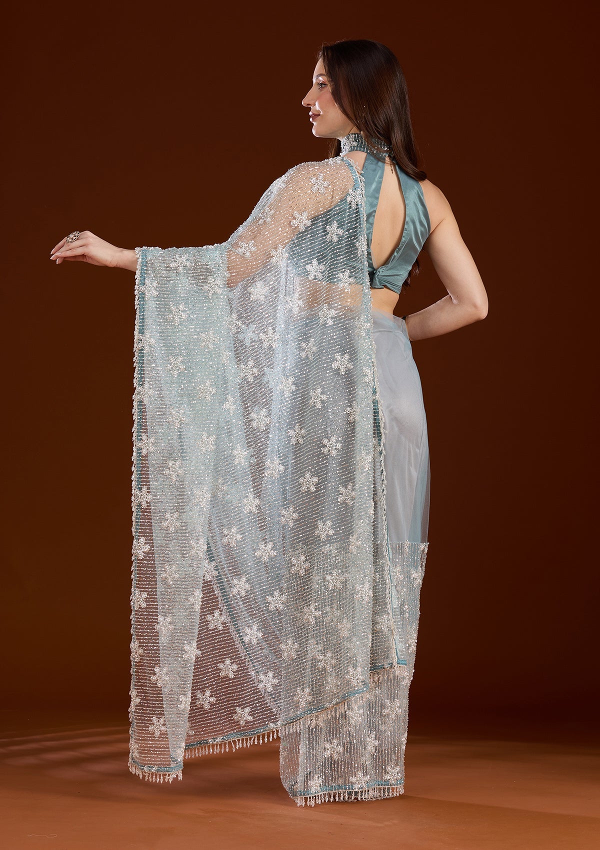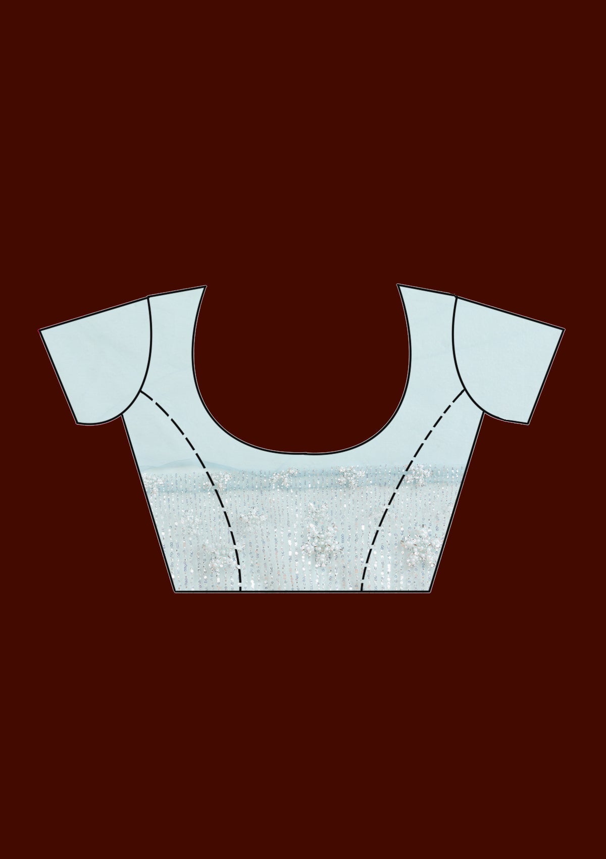 Sky Blue Saree in Net fabric. The Saree is elevated with Sequins embroidery. It comes with an Unstitched blouse. Comes with the Koskii promise of premium quality.