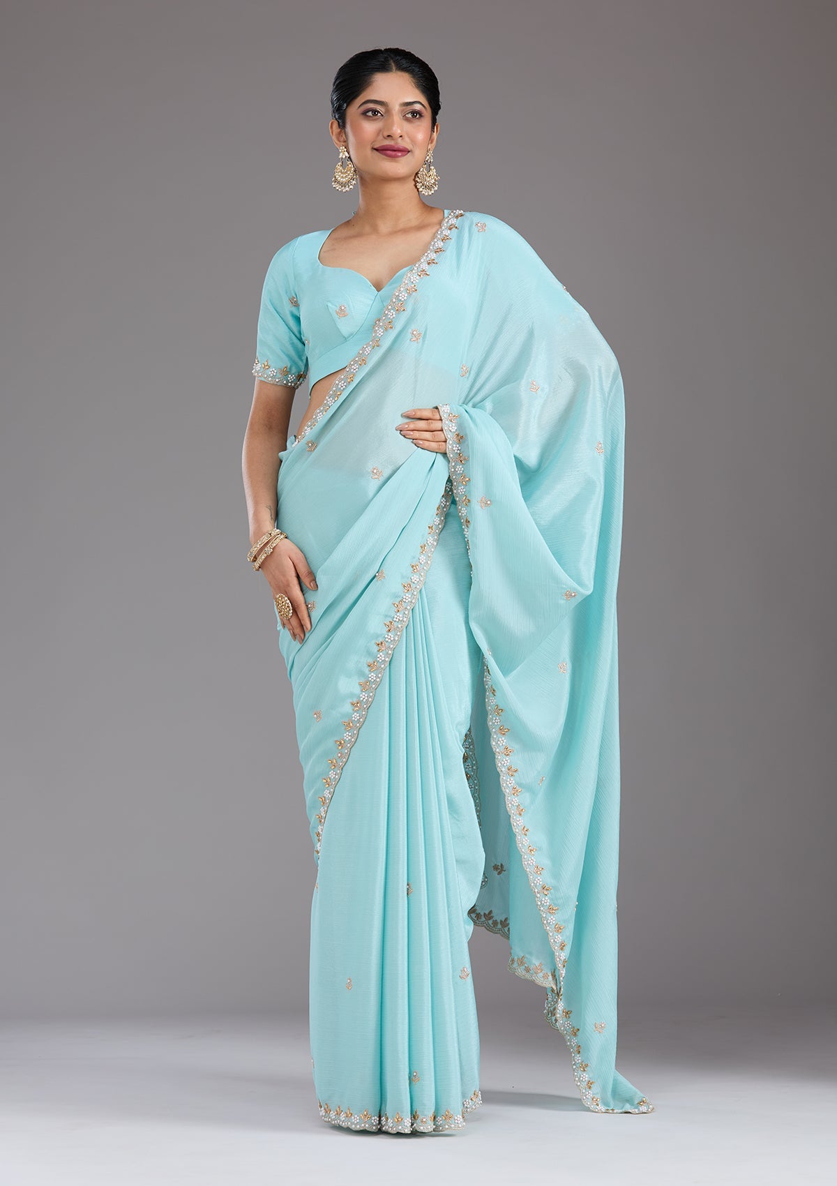 Sky Blue Saree in Chinon fabric. The Saree is elevated with Zariwork (Gold) embroidery. It comes with an Unstitched blouse. Comes with the Koskii promise of premium quality.