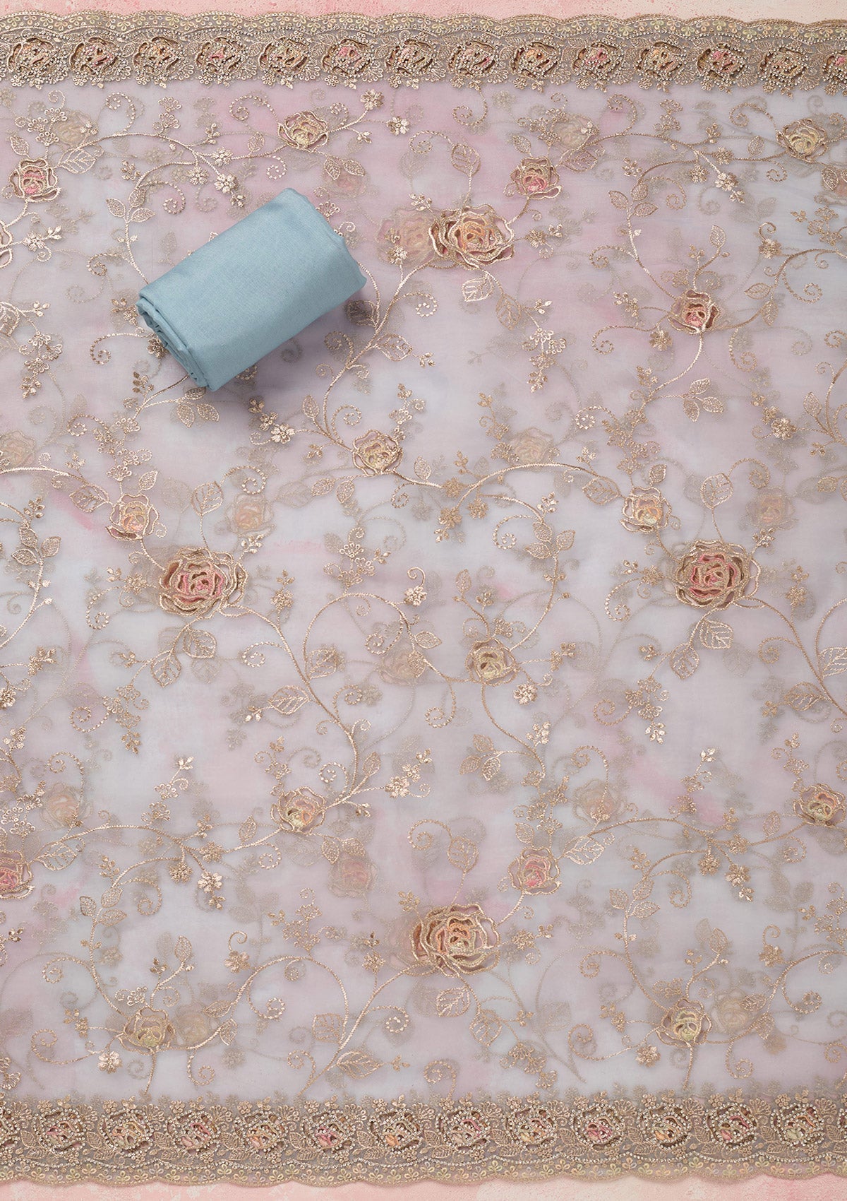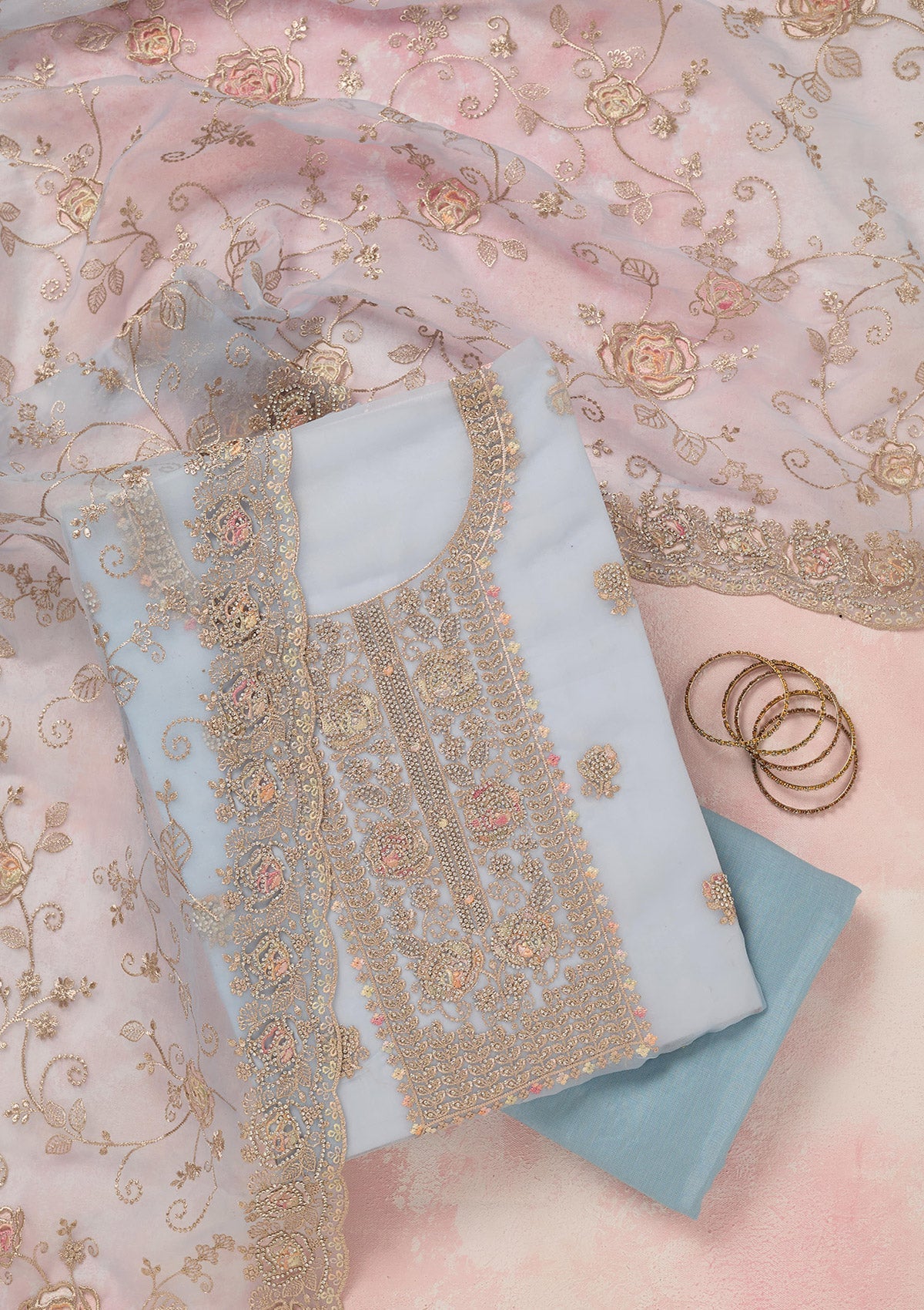 Sky Blue Zariwork (Gold) Organza Unstitched Salwar Suit