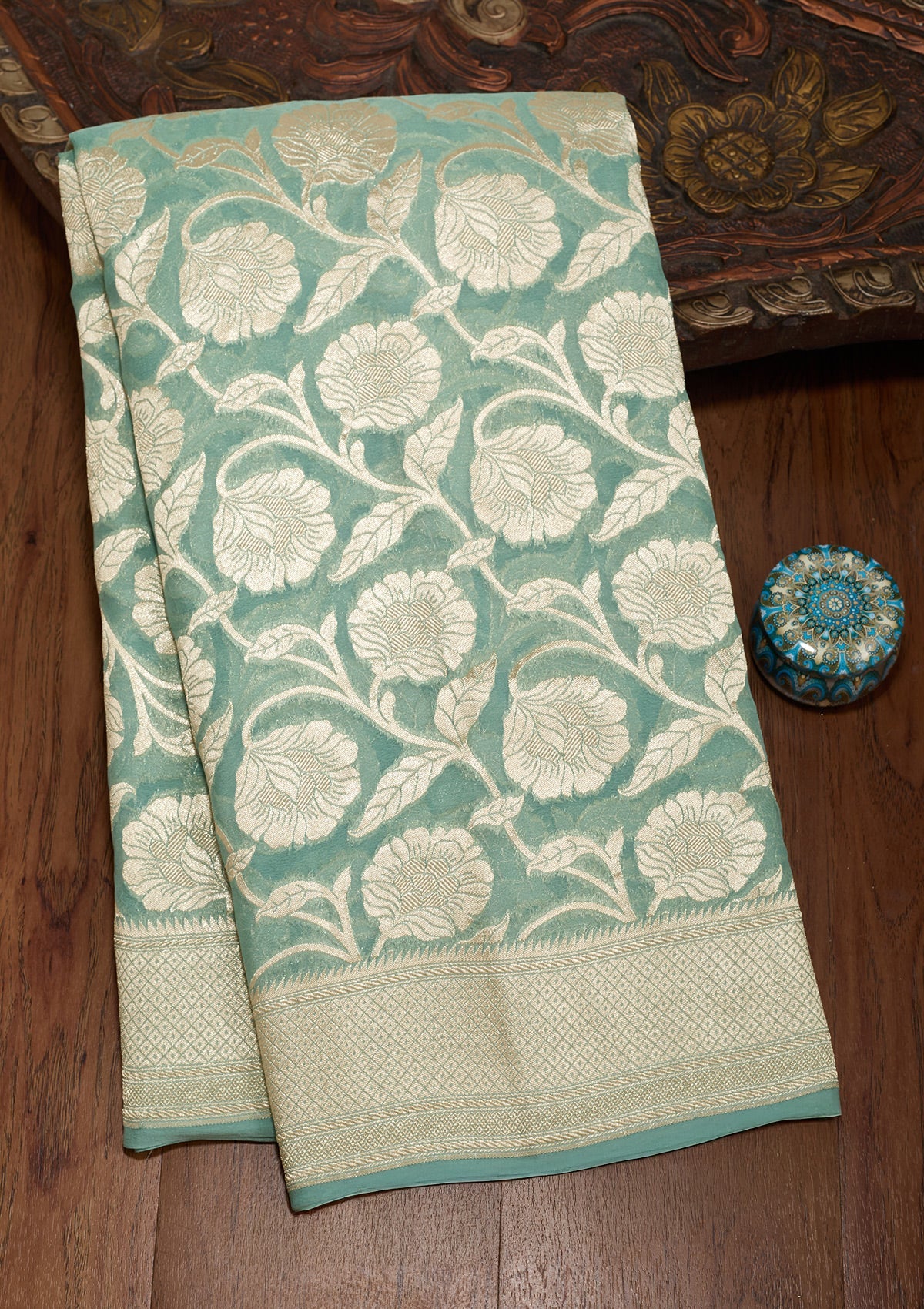 Sky Blue Silk_Saree in Pure Silk fabric. The Silk_Saree is elevated with Zariwork (Gold) embroidery. It comes with an Unstitched blouse. Comes with the Koskii promise of premium quality.