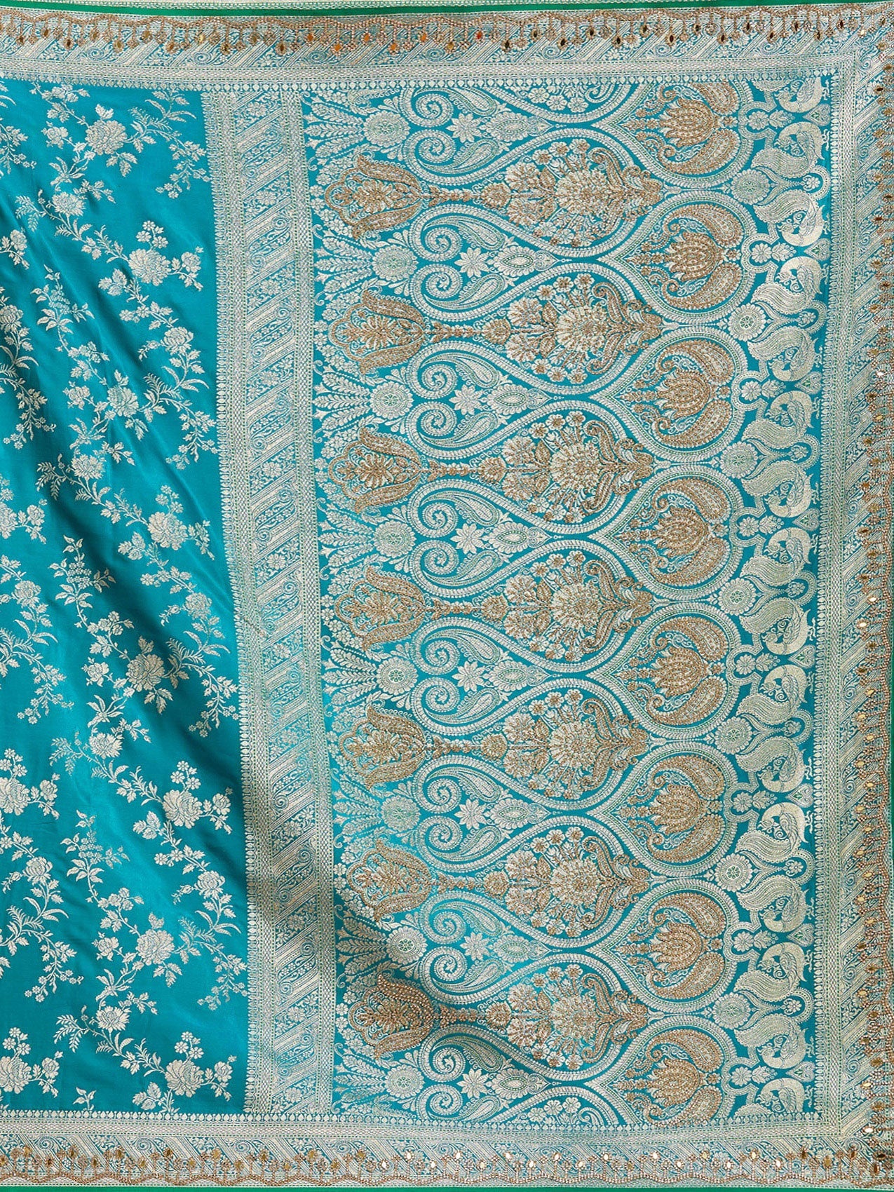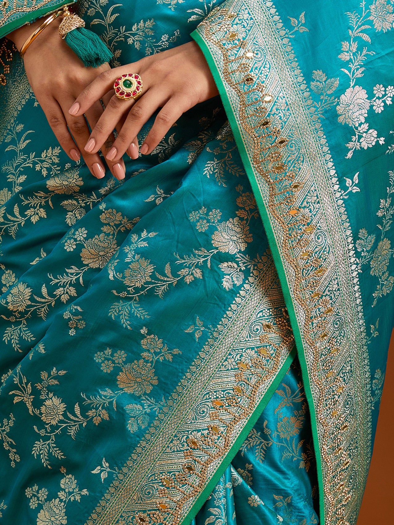 Turquoise Blue Silk_Saree in Silk fabric. The Silk_Saree is elevated with Stonework embroidery. It comes with an Unstitched blouse. Comes with the Koskii promise of premium quality.