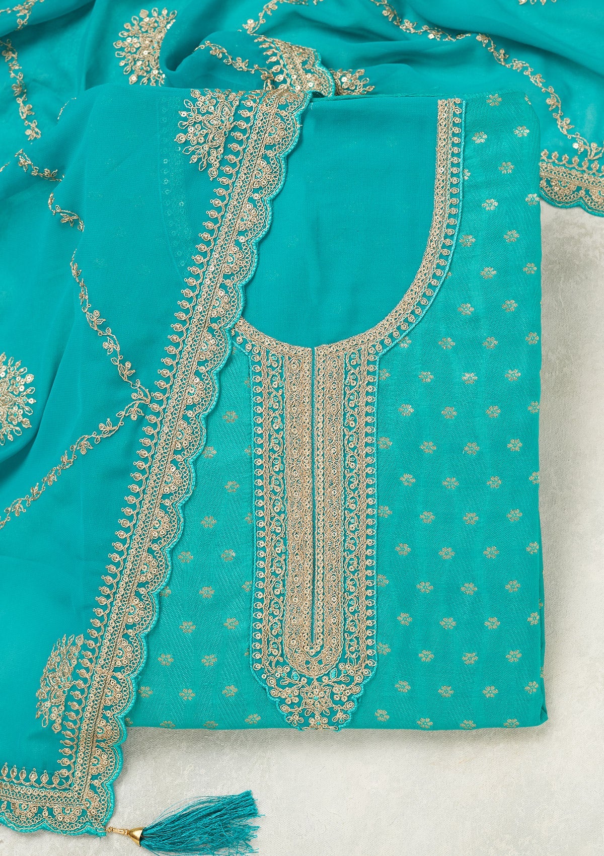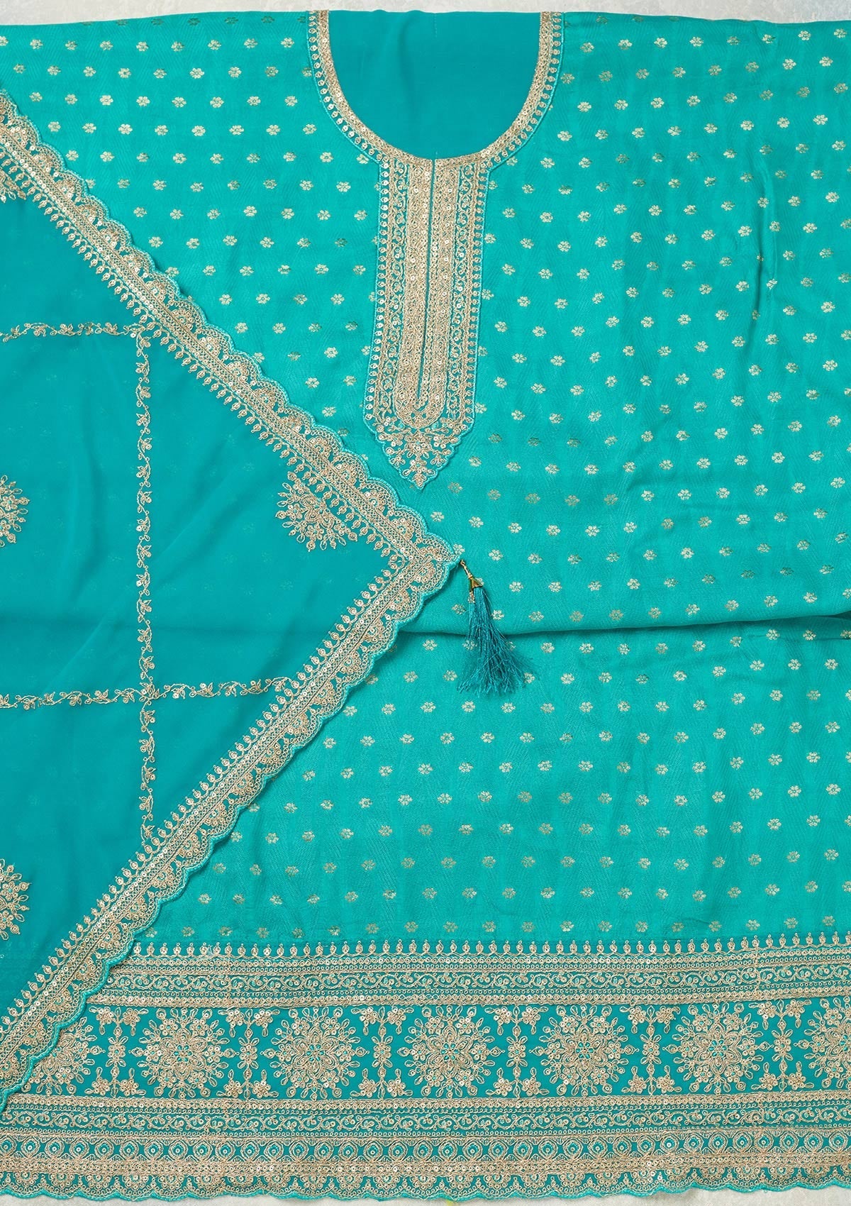 Turquoise Blue Zariwork (Gold) Chanderi Unstitched Salwar Suit