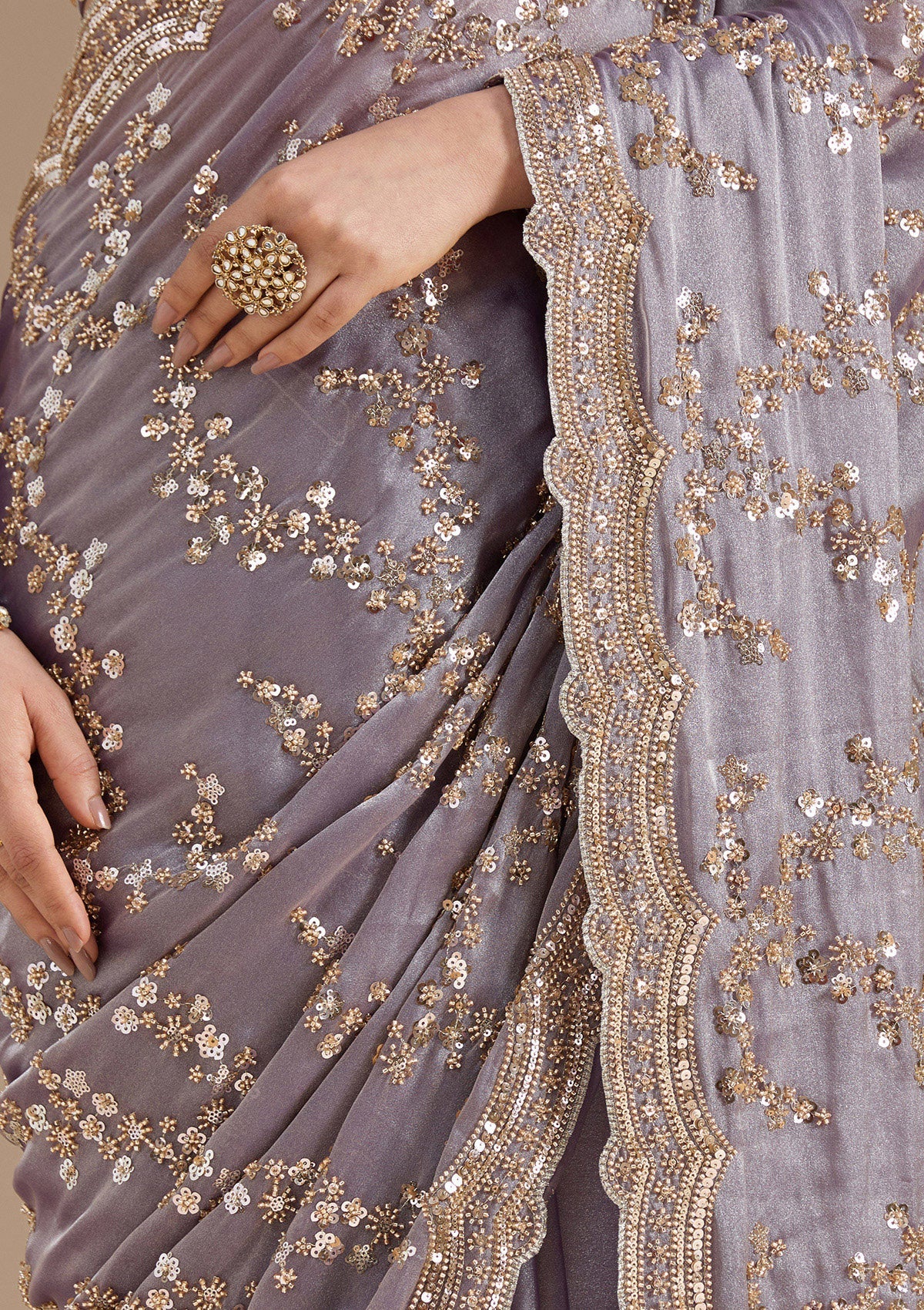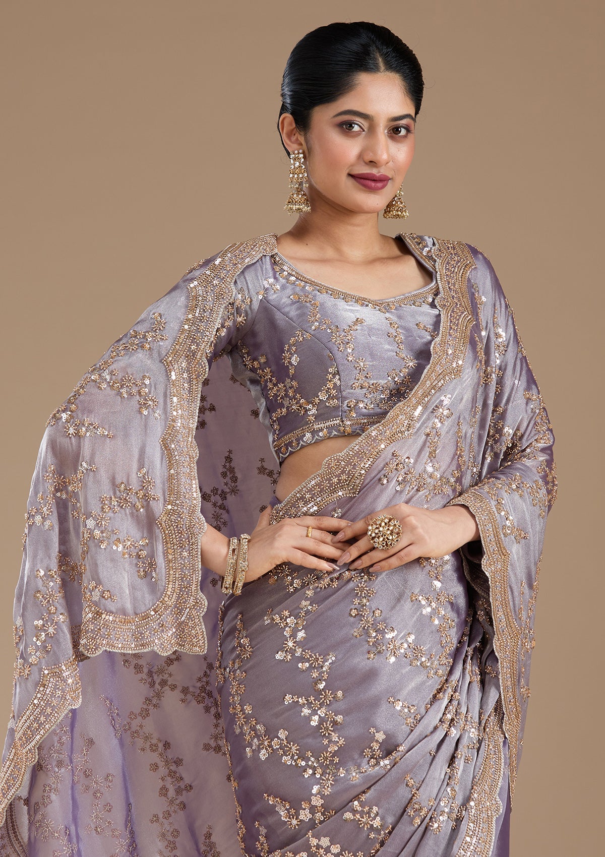Violet Saree in Tissue fabric. The Saree is elevated with Cutdana embroidery. It comes with an Unstitched blouse. Comes with the Koskii promise of premium quality.