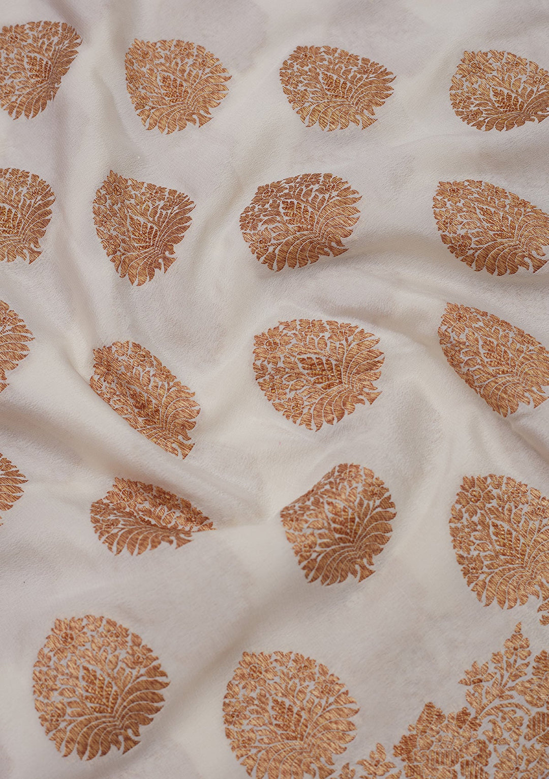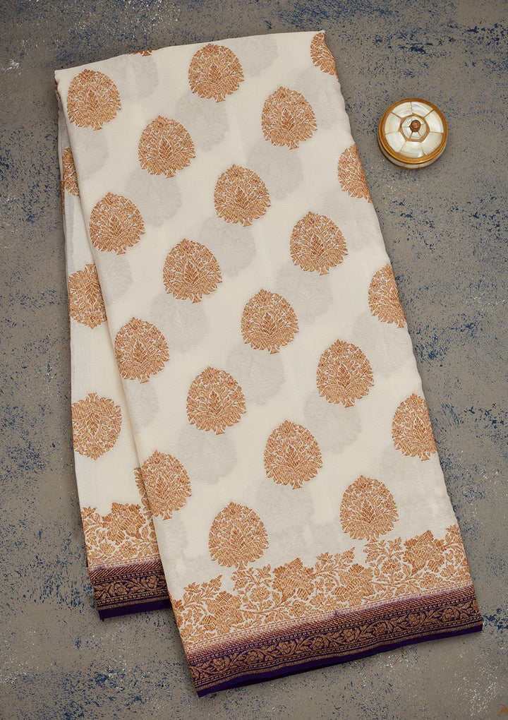 White Saree in Pure Silk fabric. The Saree is elevated with Zariwork embroidery. It comes with an Unstitched blouse. Comes with the Koskii promise of premium quality.