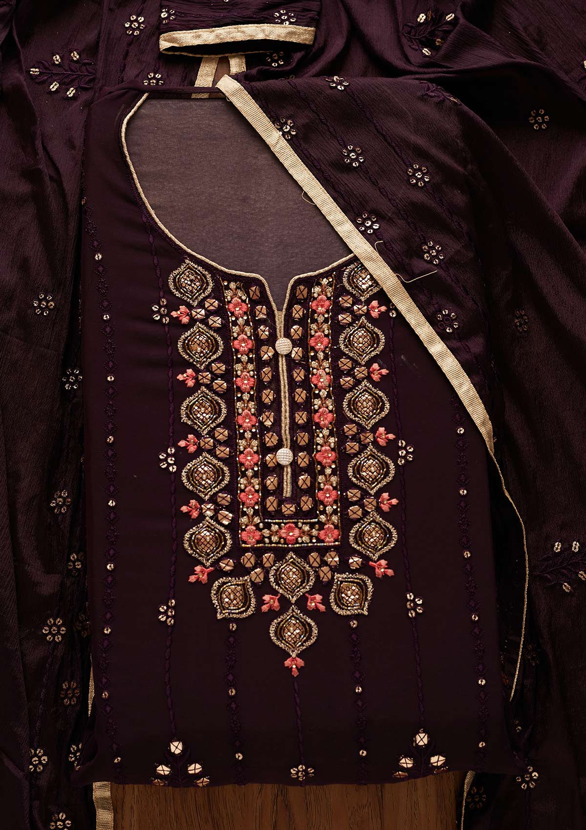 Wine Salwar Suit In Georgette Fabric. The Salwar Suit Is Embellished With Cutdana Embroidery. Accompanied with an unstitched bottom and dupatta. Comes With The Koskii Promise Of Premium Quality.