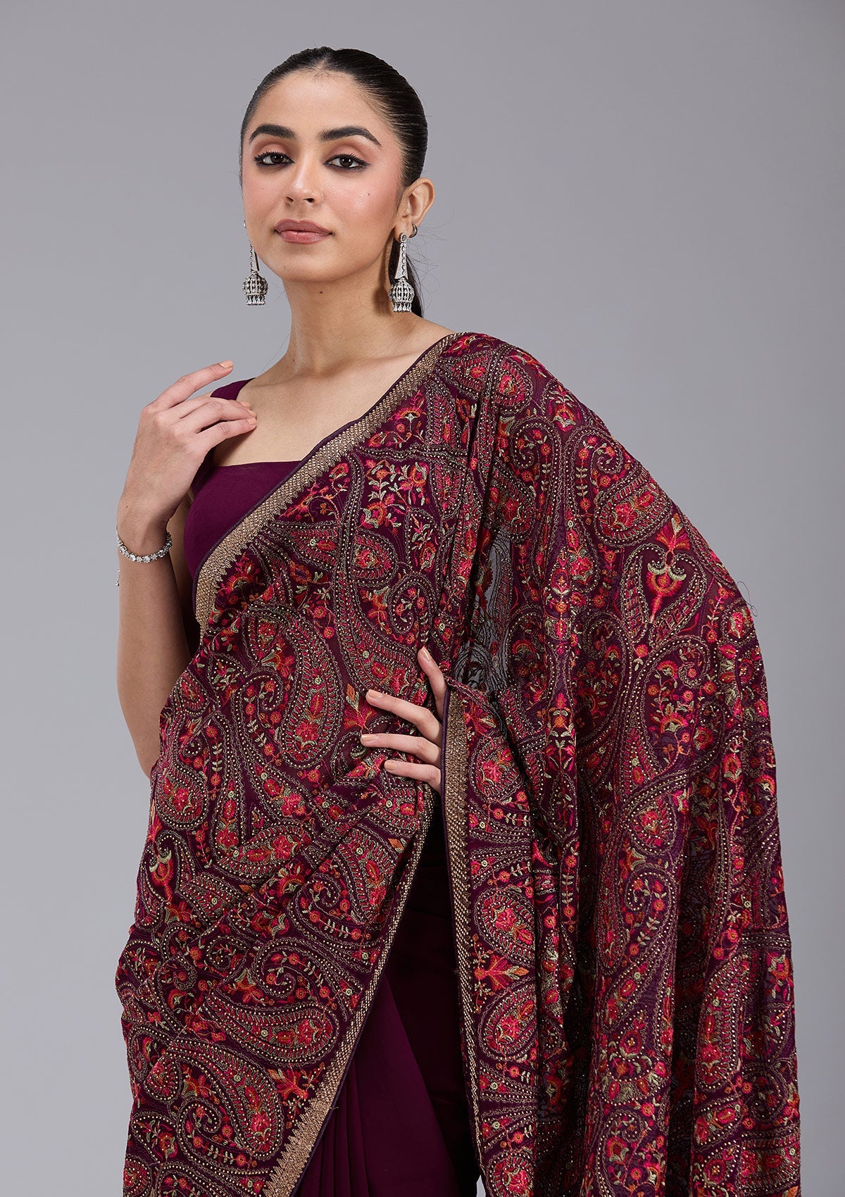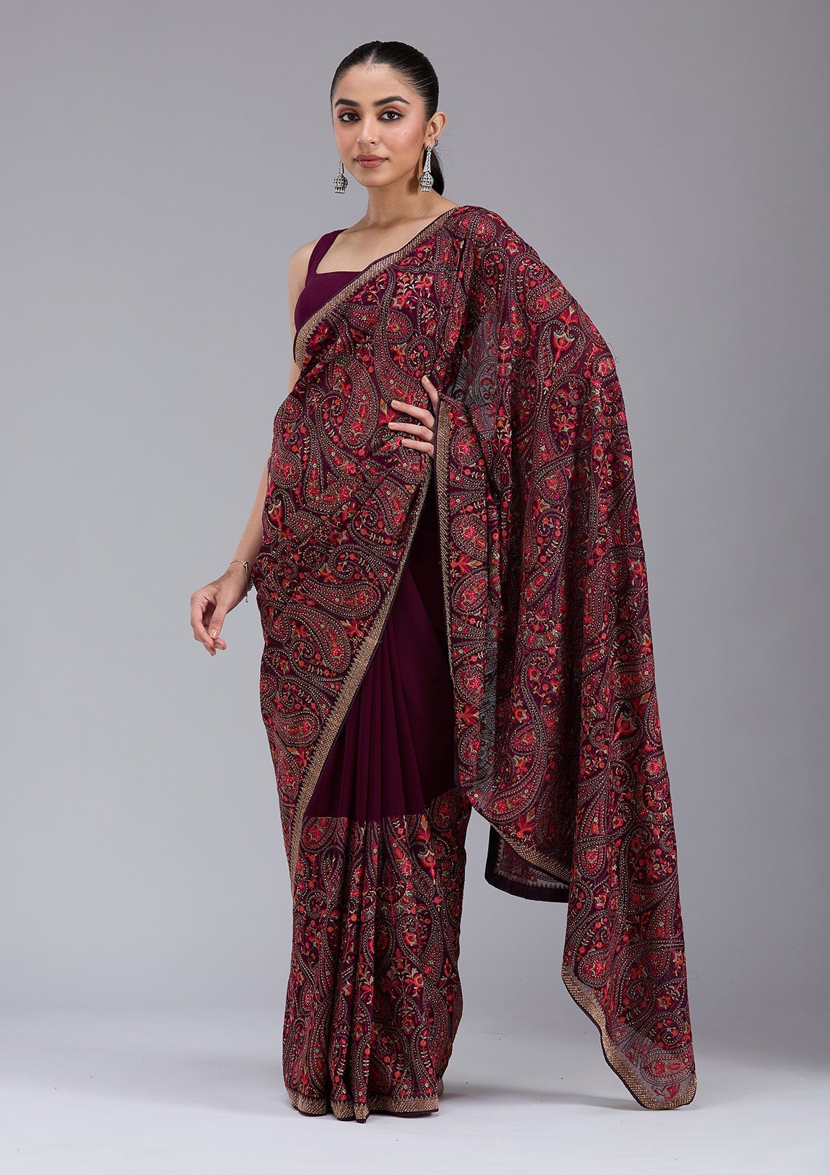 Wine Saree in Georgette fabric. The Saree is elevated with Kashmiri embroidery. It comes with an Unstitched blouse. Comes with the Koskii promise of premium quality.