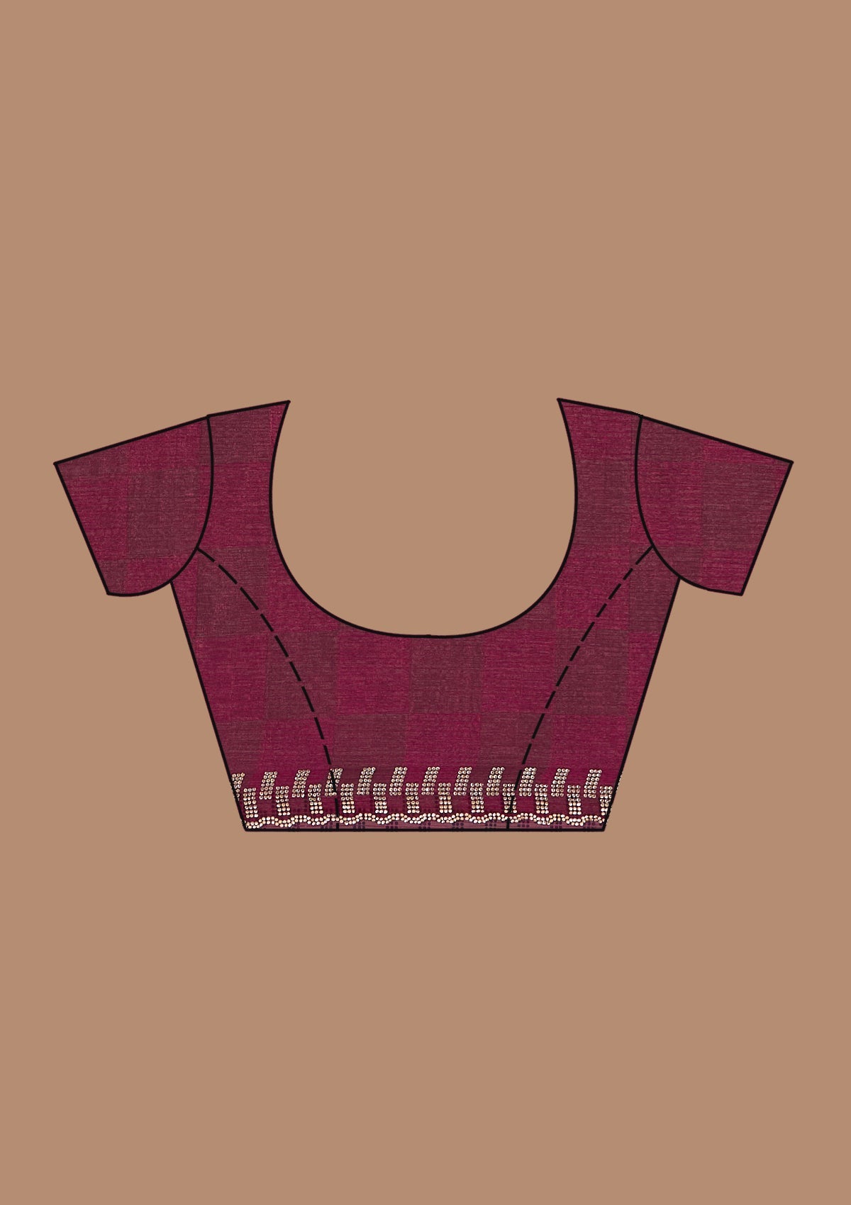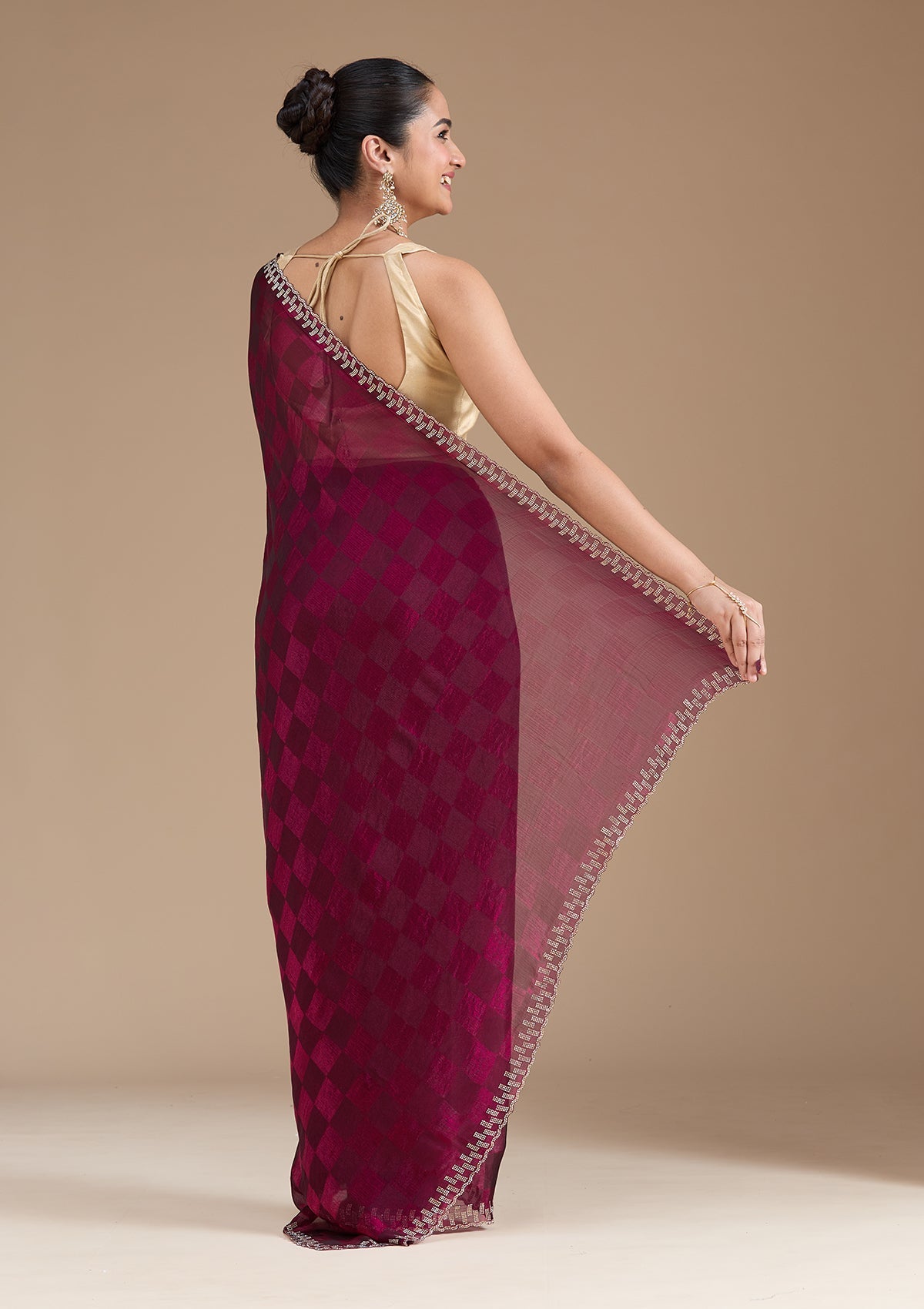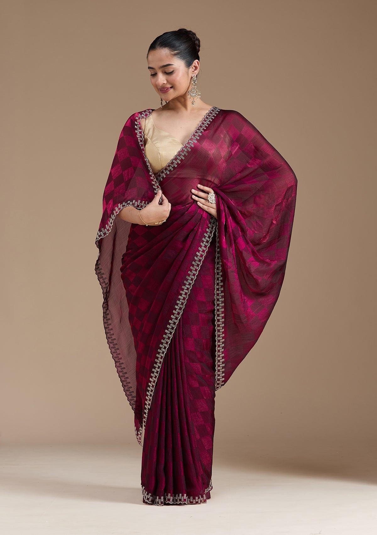 Wine Saree in Tissue fabric. The Saree is elevated with Stonework (Gold) embroidery. It comes with an Unstitched blouse. Comes with the Koskii promise of premium quality.