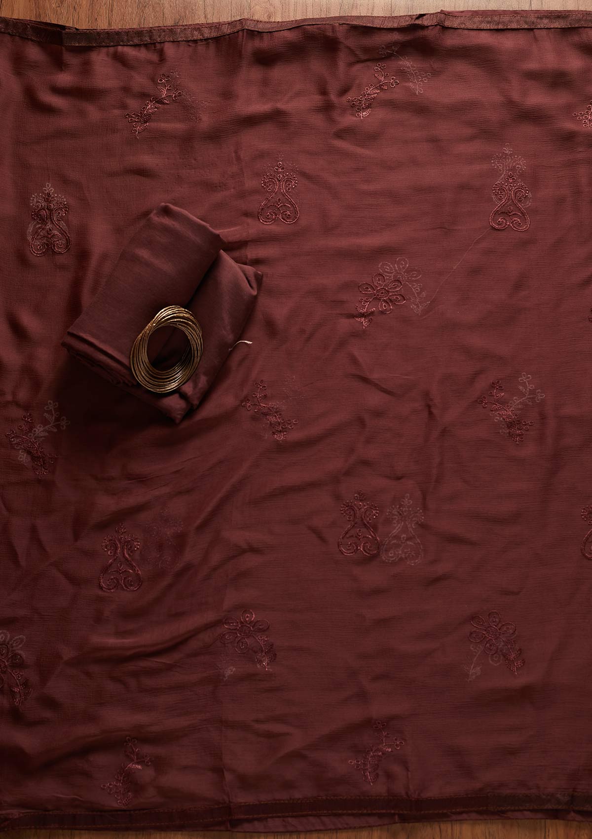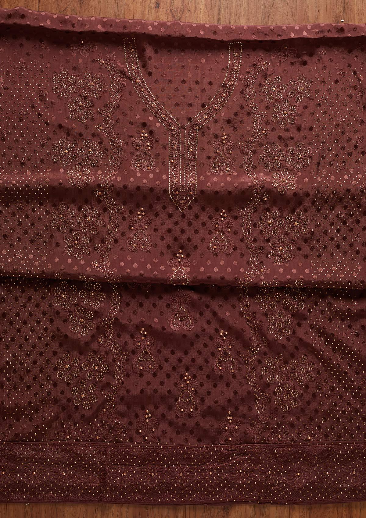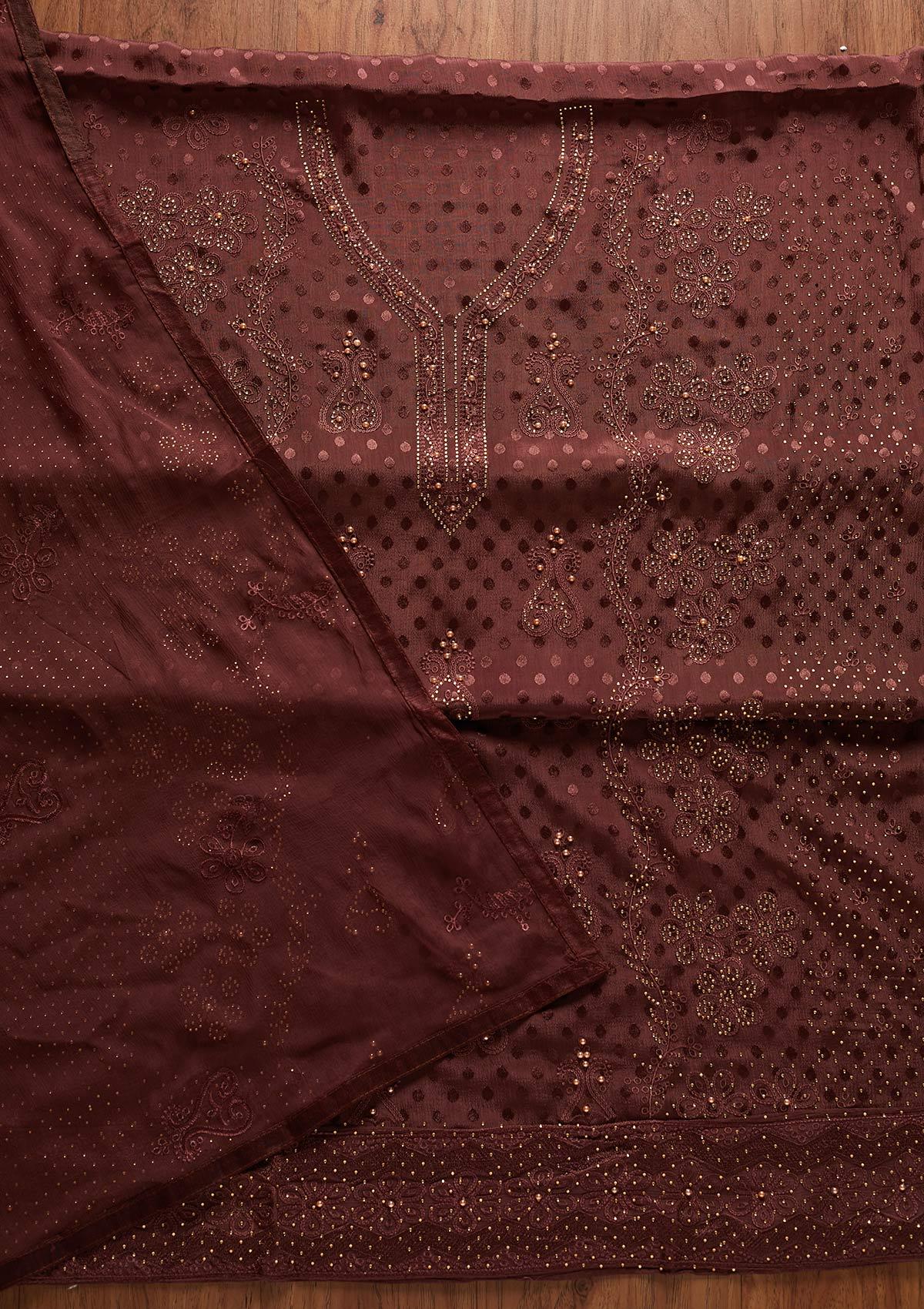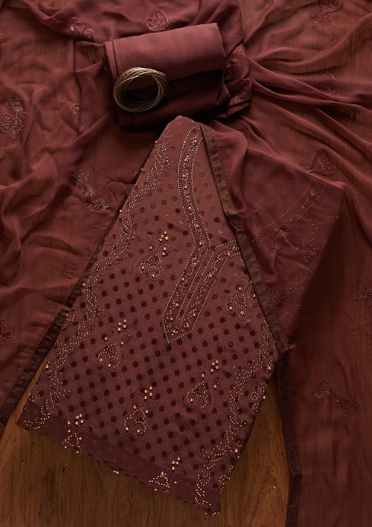 Wine Salwar Suit In Georgette Fabric. The Salwar Suit Is Embellished With Swarovski stone work. Accompanied with an unstitched bottom and dupatta. Comes With The Koskii Promise Of Premium Quality.