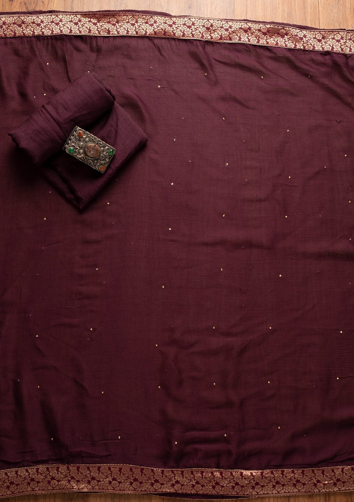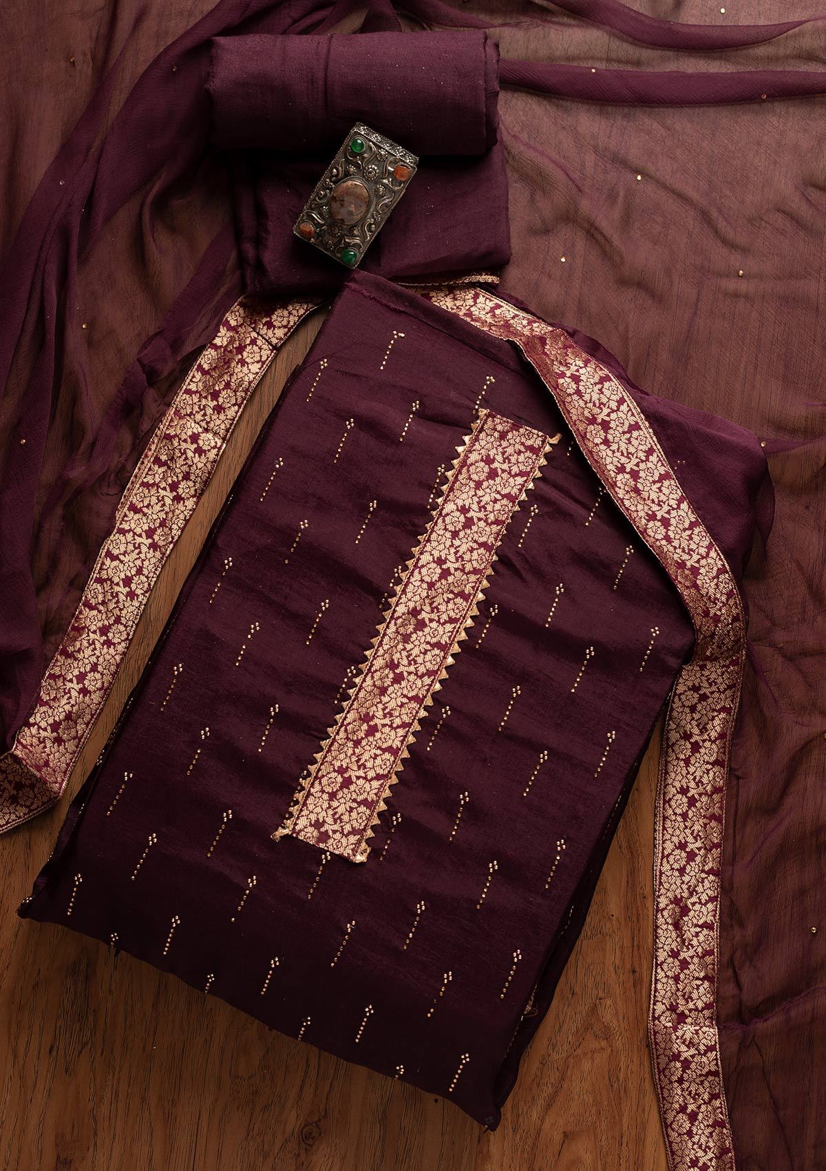 Wine Salwar Suit In Satin Fabric. The Salwar Suit Is Embellished With Swarovski stone work. Accompanied with an unstitched bottom and dupatta. Comes With The Koskii Promise Of Premium Quality.