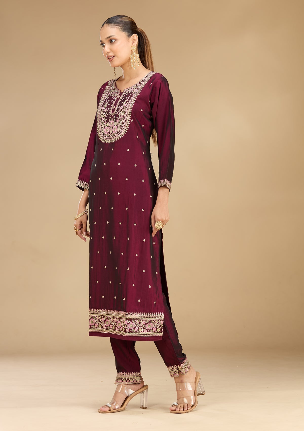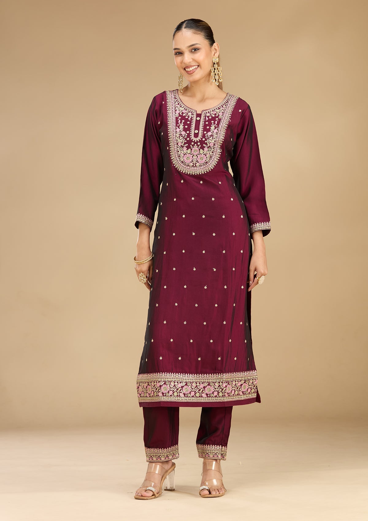 Wine Salwar_RM in Soft Raw Silk fabric. The Salwar_RM is embellished with Threadwork embroidery. Accompanied with a bottom and dupatta. Comes with the Koskii promise of premium quality.