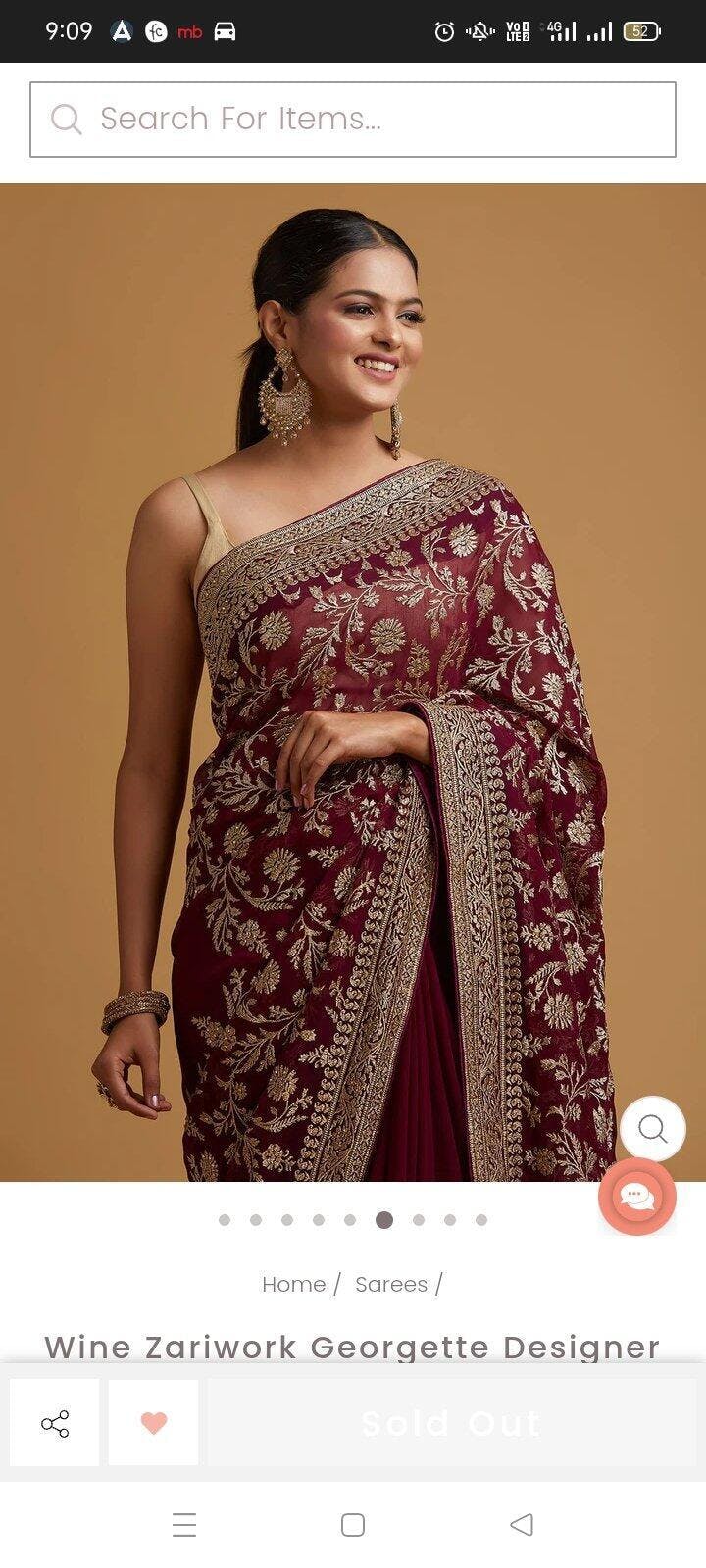 Wine saree in georgette fabric. Embellished with zariwork embroidery. Accompanied with a matching unstitched blouse. The blouse worn by the model is for styling purpose only. Comes with the koskii promise of superior quality.
