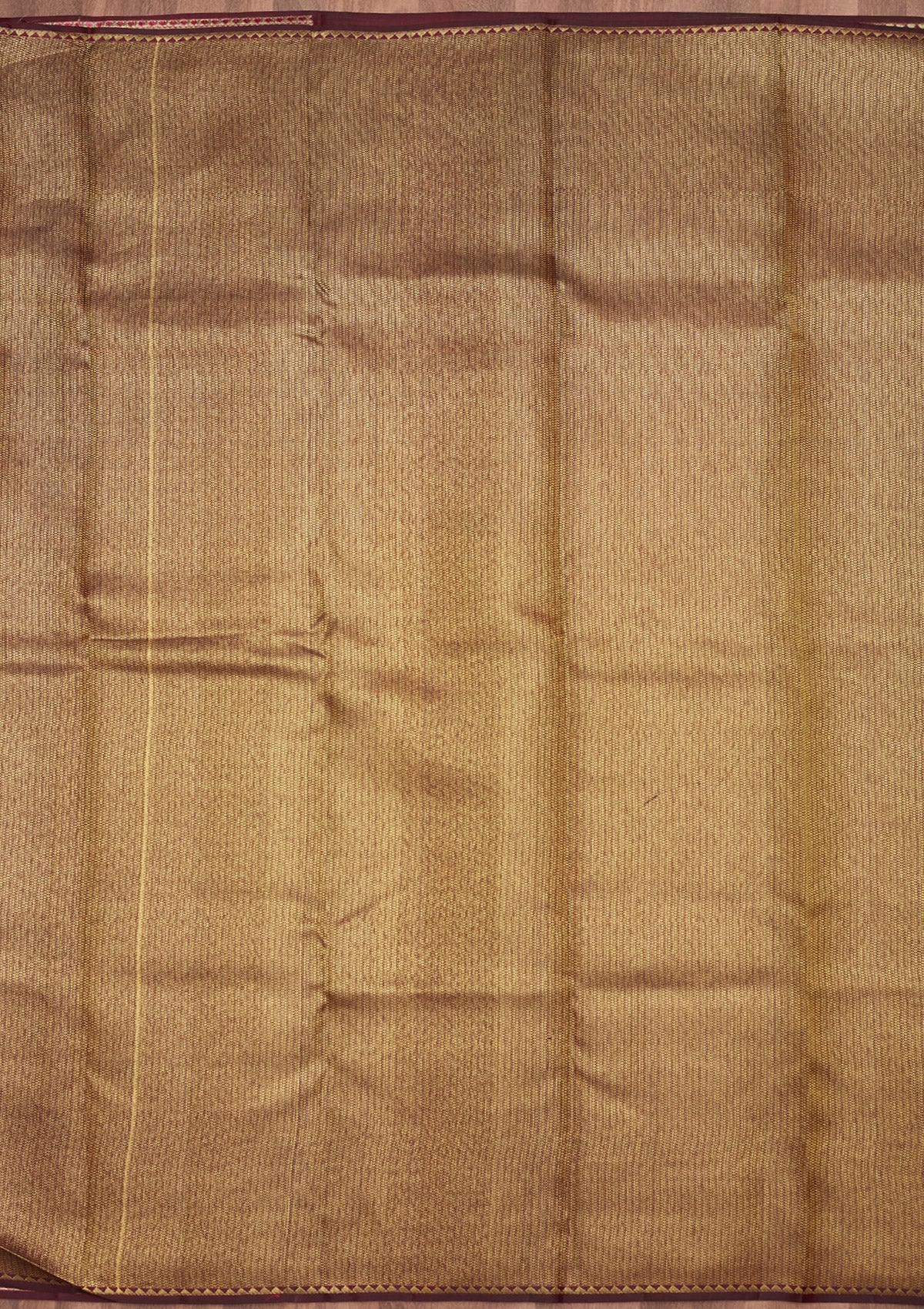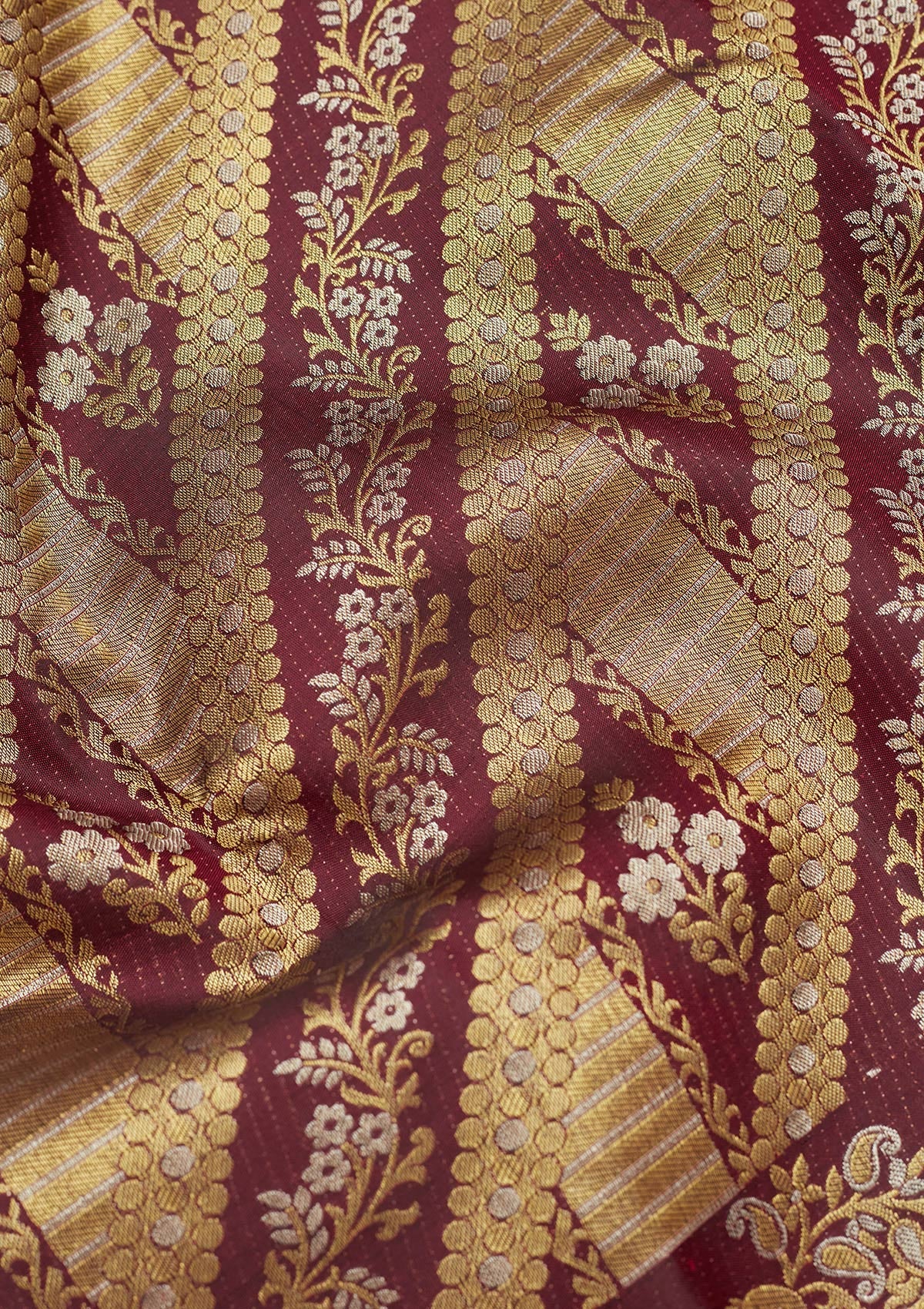 Wine Silk_Saree in Pure Silk fabric. The Silk_Saree is elevated with Zariwork (Gold) embroidery. It comes with an Unstitched blouse. Comes with the Koskii promise of premium quality.
