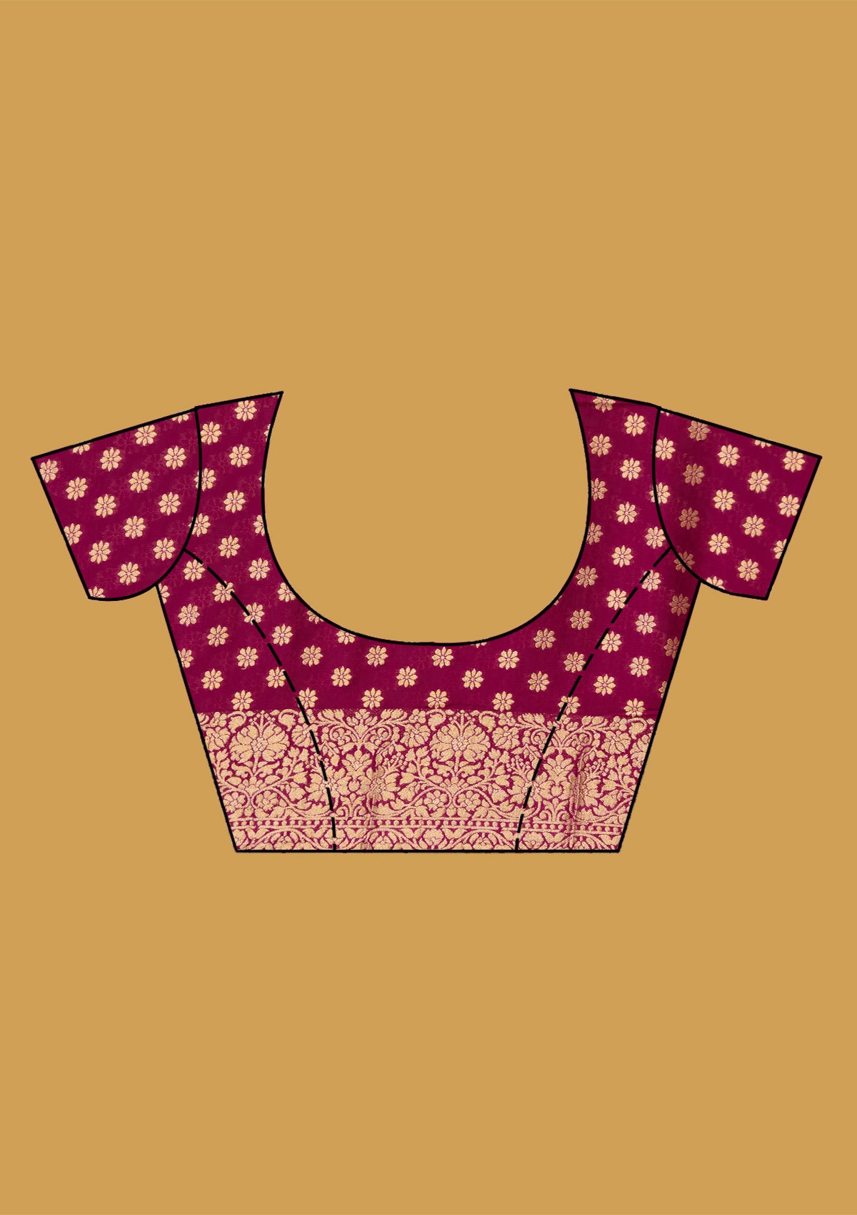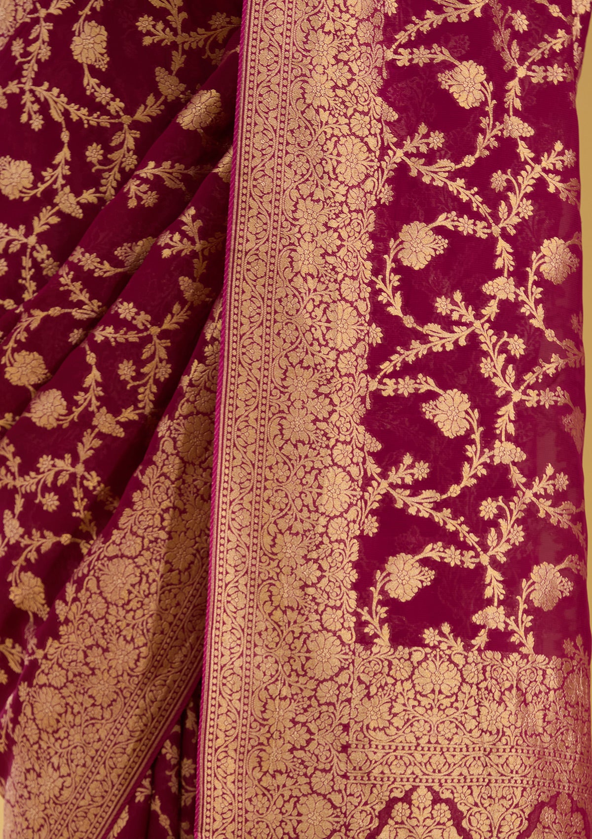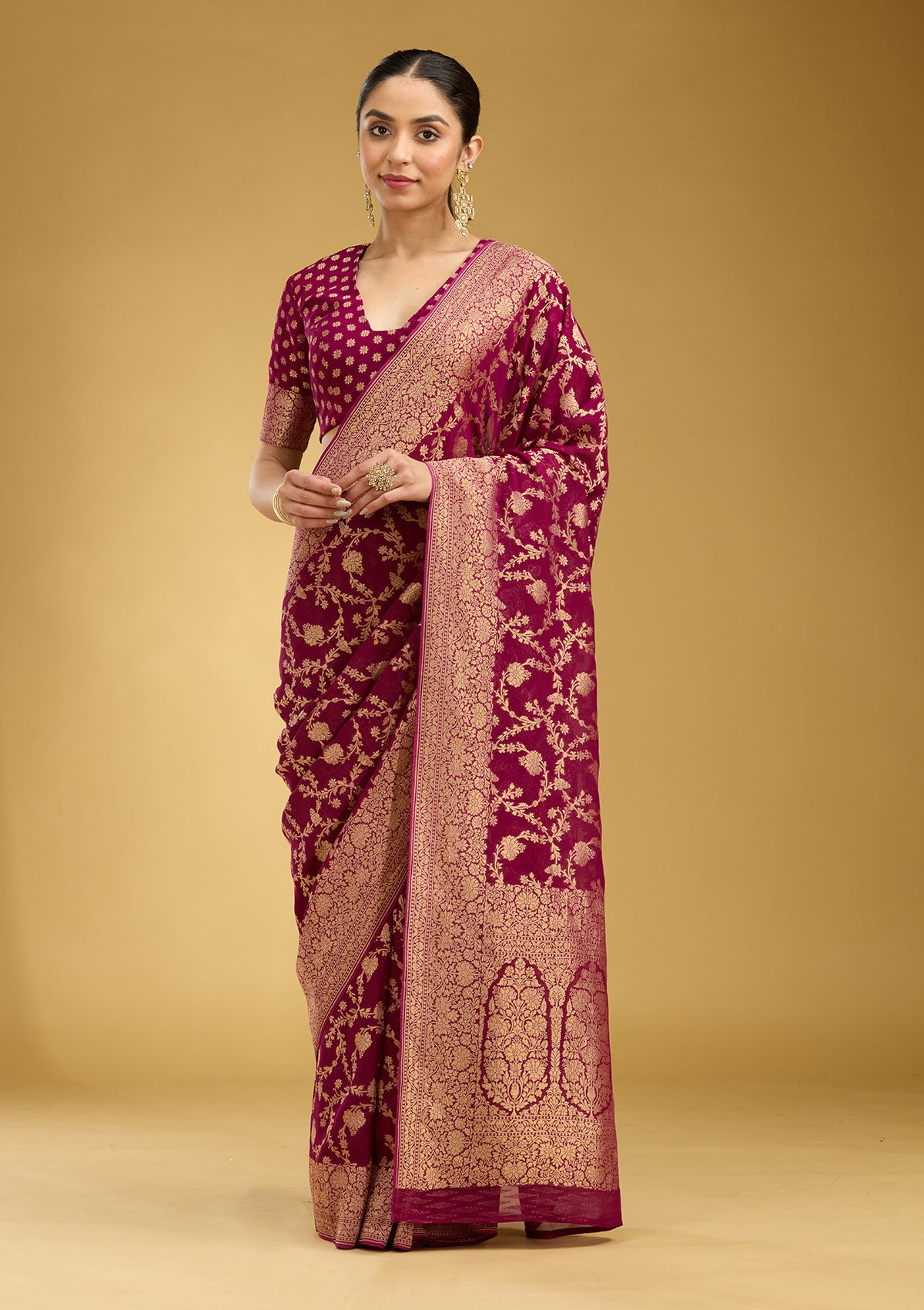 Wine Silk_Saree in Silk fabric. The Silk_Saree is elevated with Zariwork (Gold) embroidery. It comes with an Unstitched blouse. Comes with the Koskii promise of premium quality.