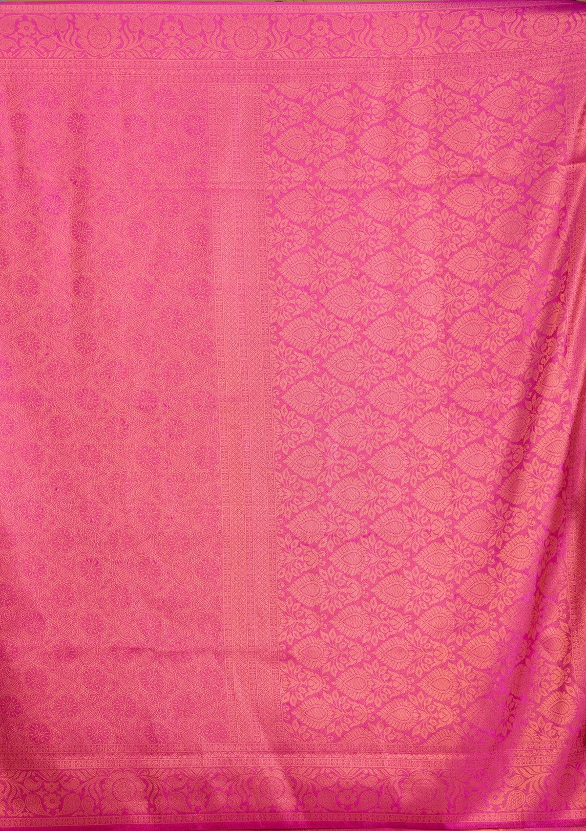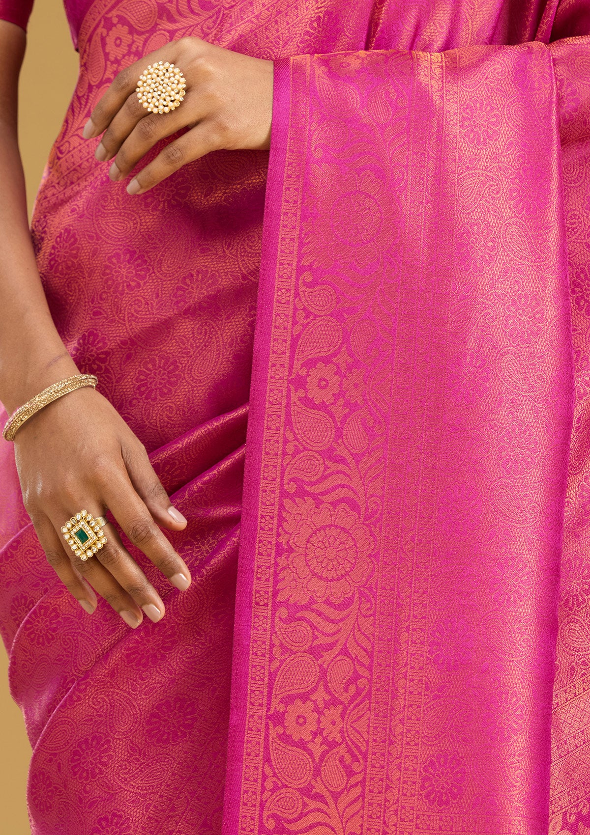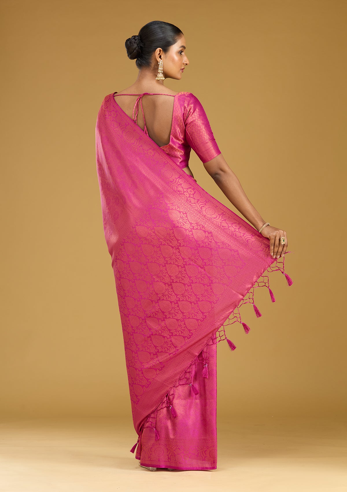 Wine Silk_Saree in Silk fabric. The Silk_Saree is elevated with Zariwork (Gold) embroidery. It comes with an Unstitched blouse. Comes with the Koskii promise of premium quality.