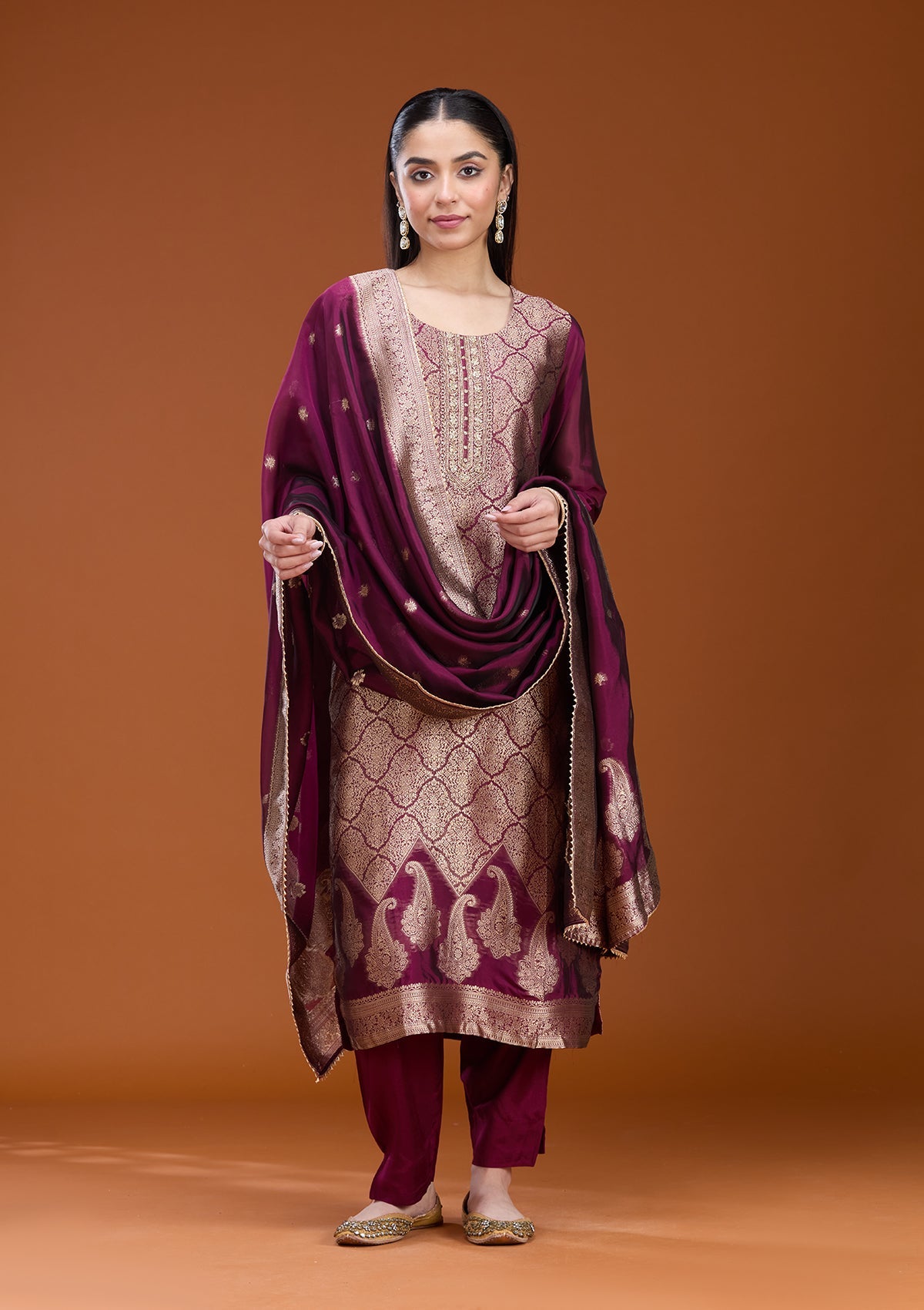 Wine Salwar_RM in Soft Raw Silk fabric. The Salwar_RM is embellished with Zariwork (Gold) embroidery. Accompanied with a bottom and dupatta. Comes with the Koskii promise of premium quality.