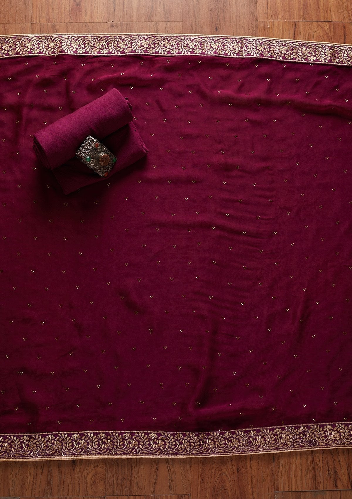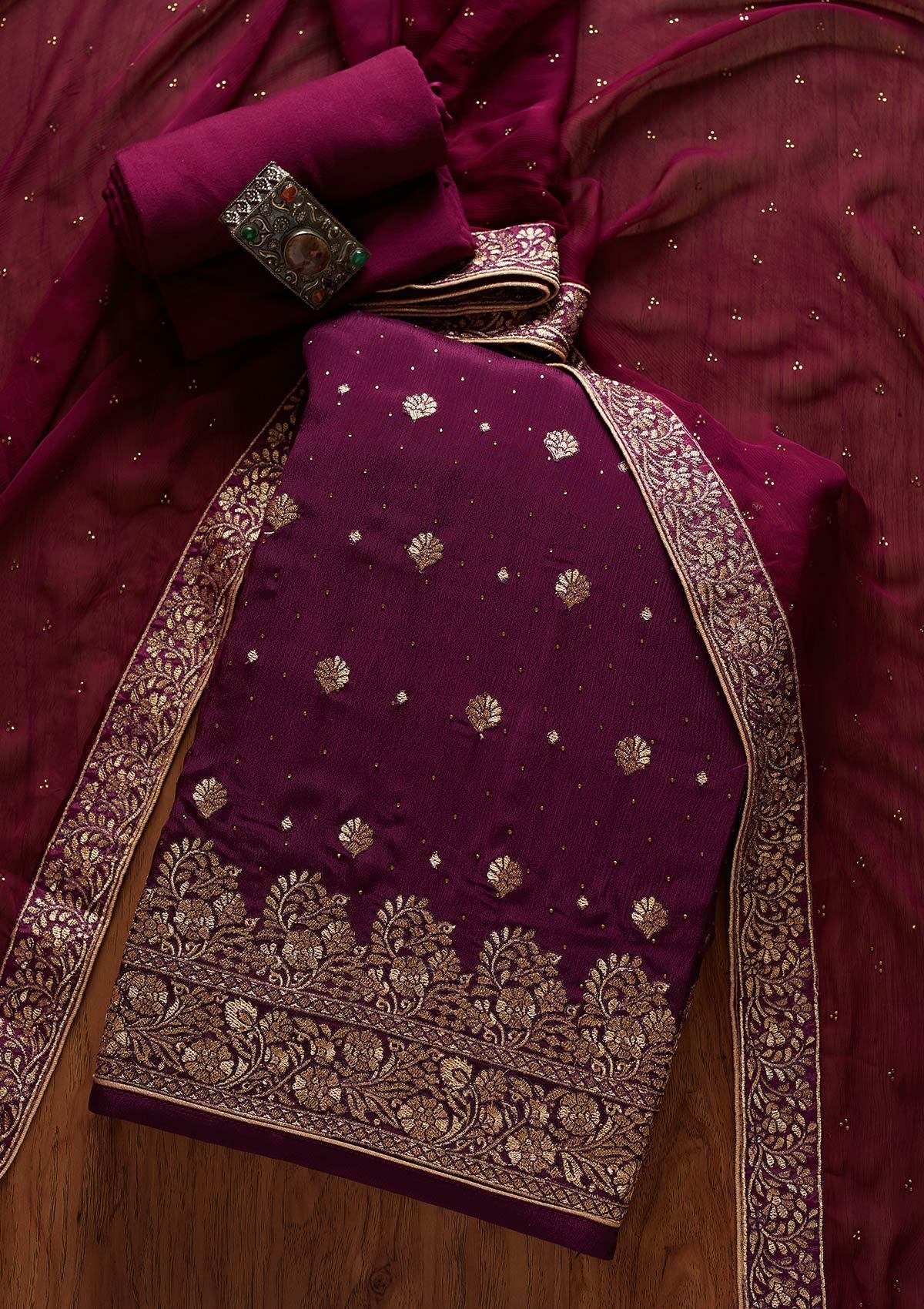 Wine Salwar Suit In Semi Crepe Fabric. The Salwar Suit Is Embellished With Zariwork Embroidery. Accompanied with an unstitched bottom and dupatta. Comes With The Koskii Promise Of Premium Quality.