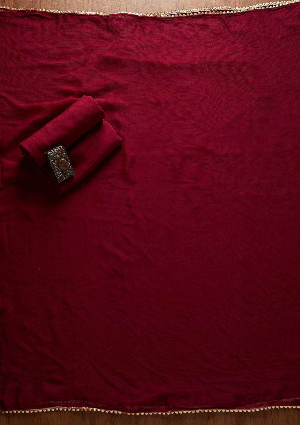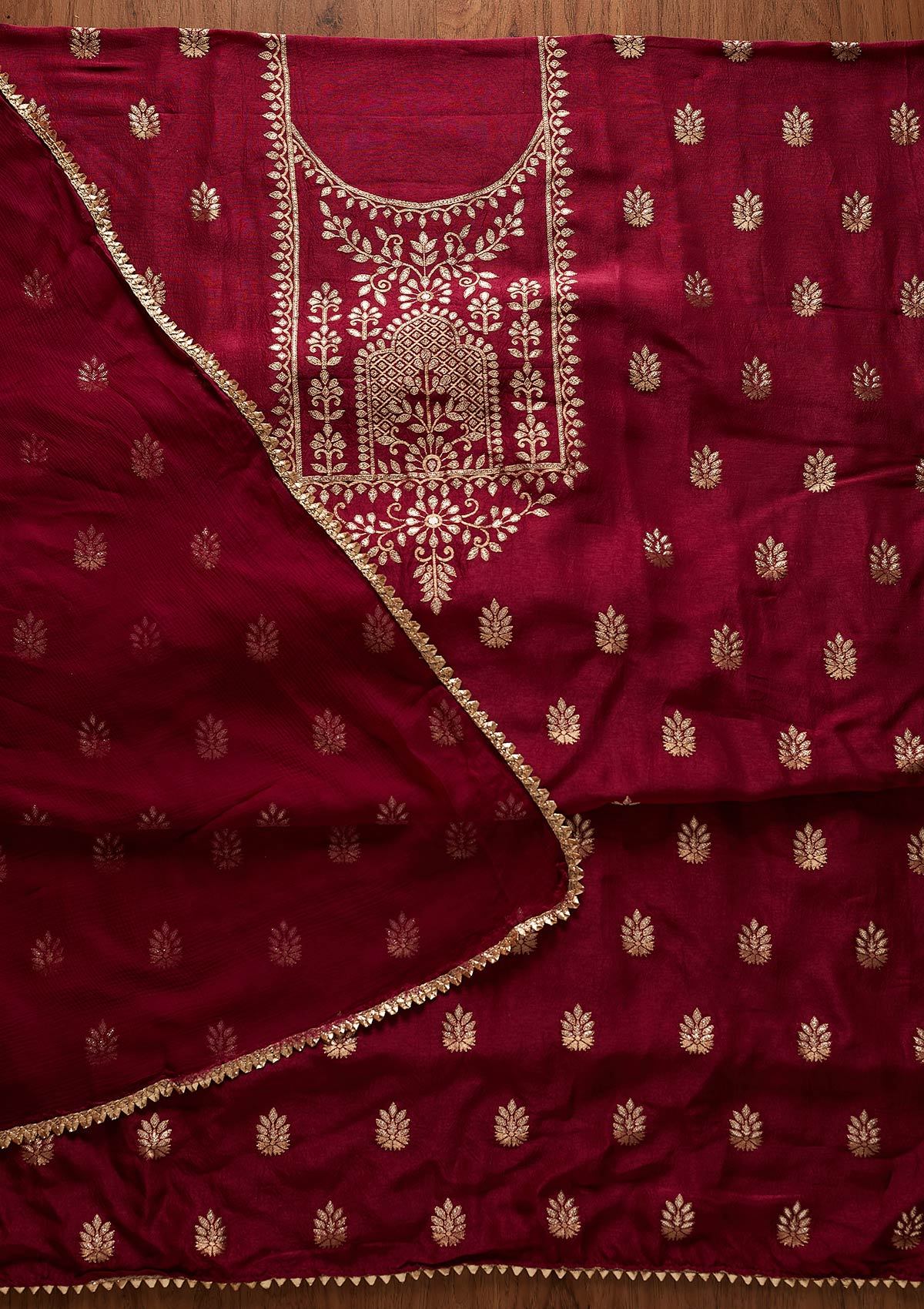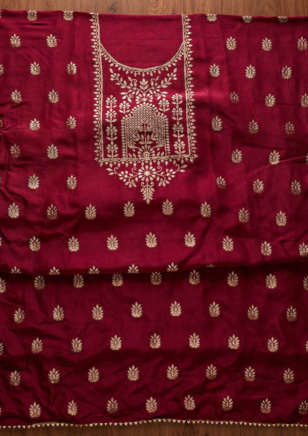 Wine Salwar Suit In Semi Crepe Fabric. The Salwar Suit Is Embellished With Zariwork Embroidery. Accompanied with an unstitched bottom and dupatta. Comes With The Koskii Promise Of Premium Quality.
