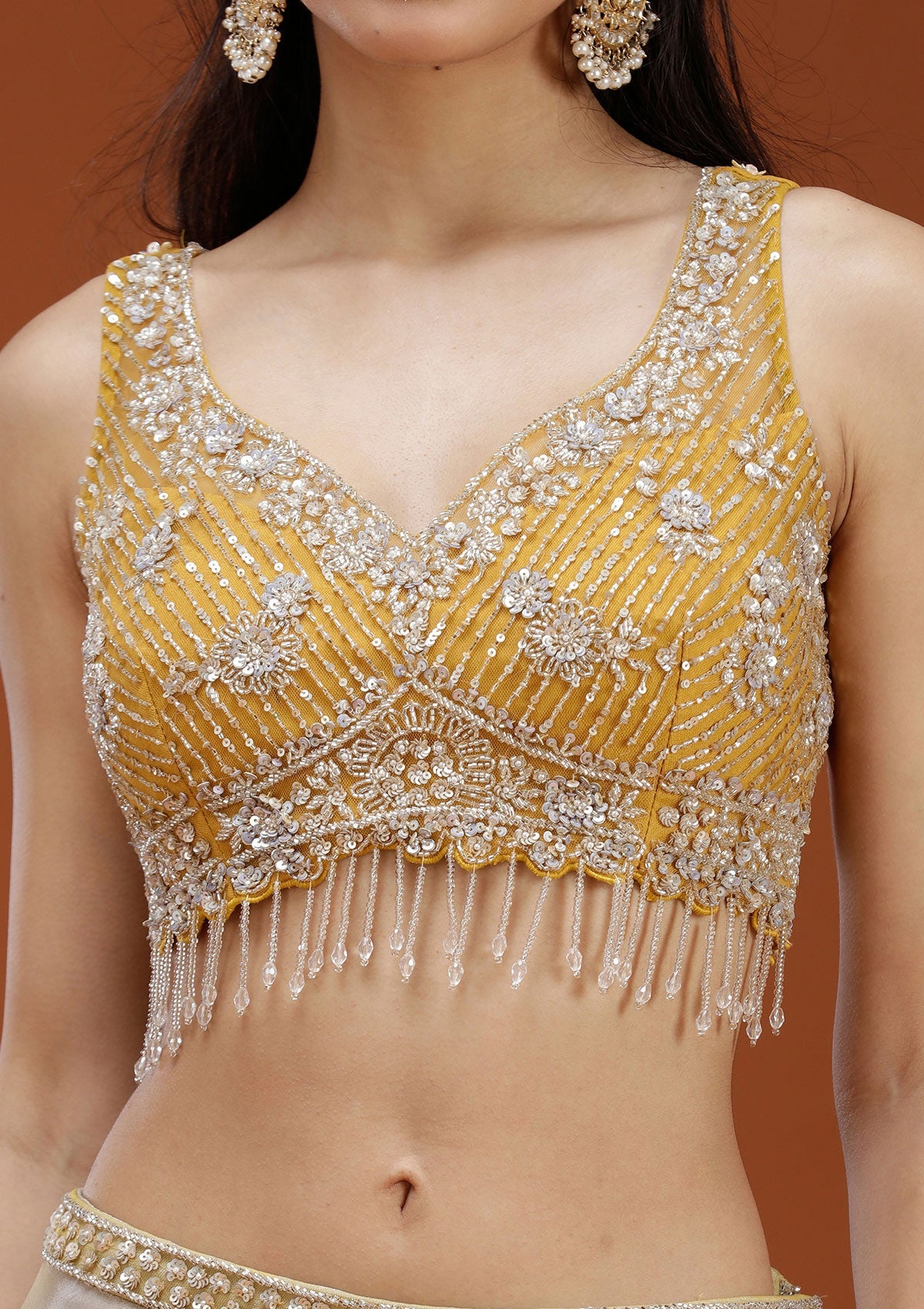 Yellow Salwar Suit in Georgette fabric. The Salwar Suit is embellished with Cutdana embroidery. Accompanied with a bottom and dupatta. Comes with the Koskii promise of premium quality.