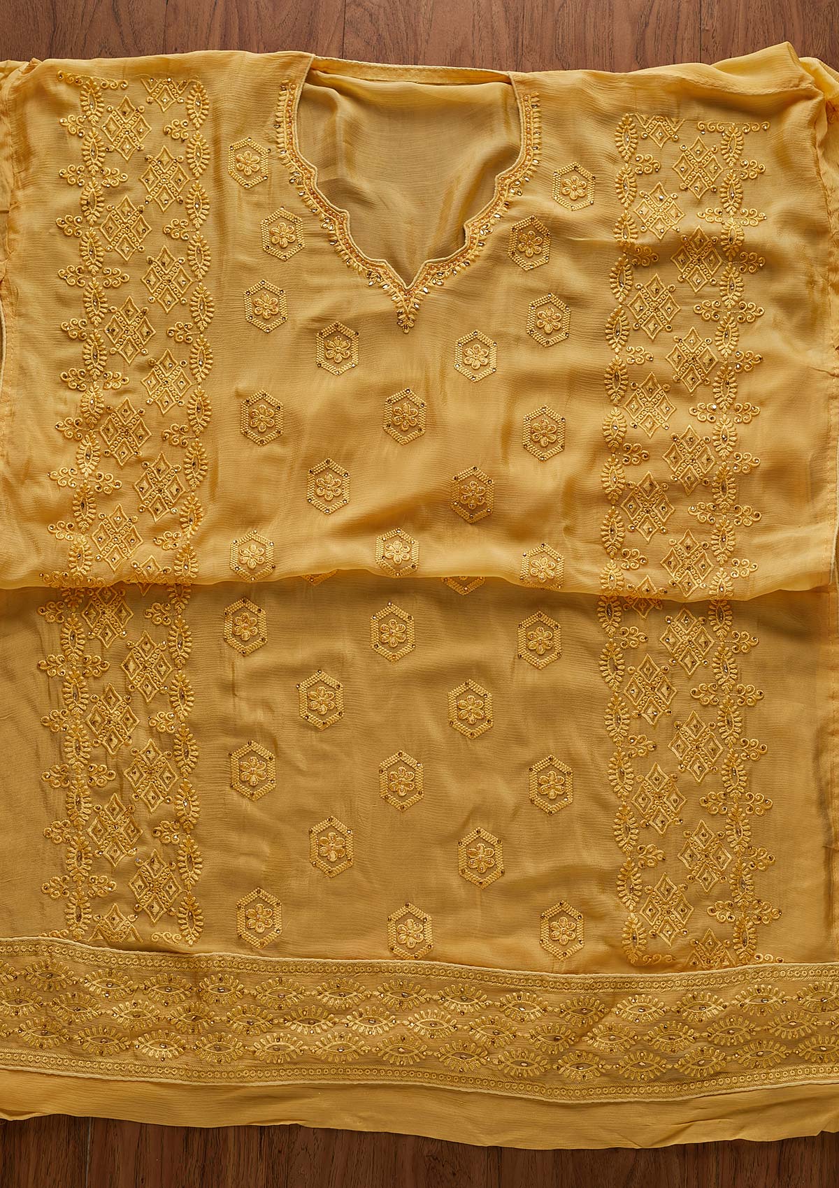 Yellow Salwar Suit In Chiffon Fabric. The Salwar Suit Is Embellished With Pearlwork Embroidery. Accompanied with an unstitched bottom and dupatta. Comes With The Koskii Promise Of Premium Quality.