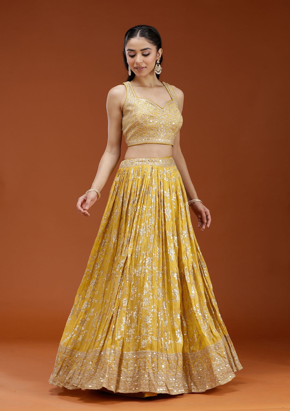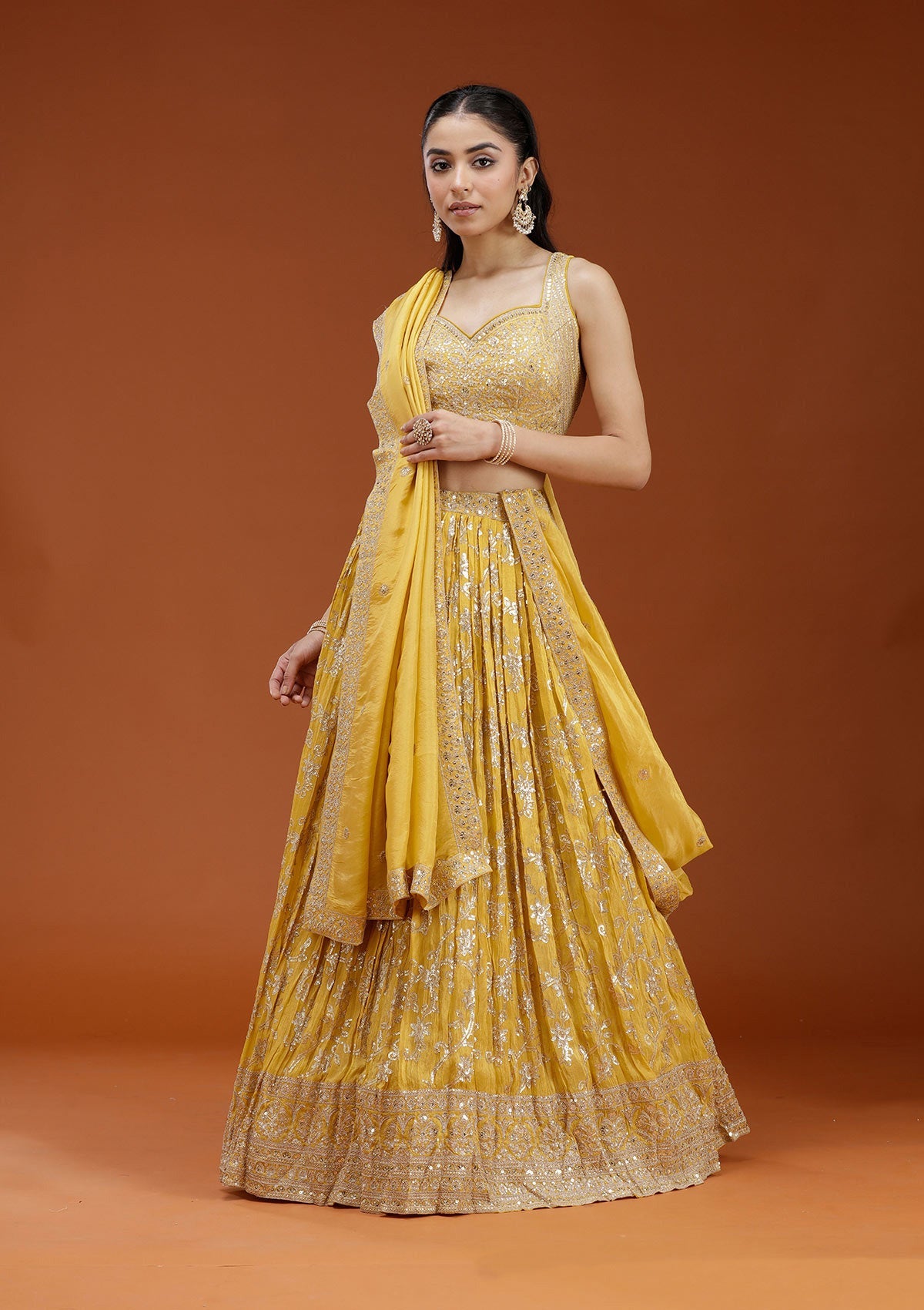 Yellow Readymade Lehenga in Shimmer fabric The Lehenga is embellished with Sequins embroidery Accompanied with an Readymade blouse and dupatta Comes with the Koskii promise of premium quality.