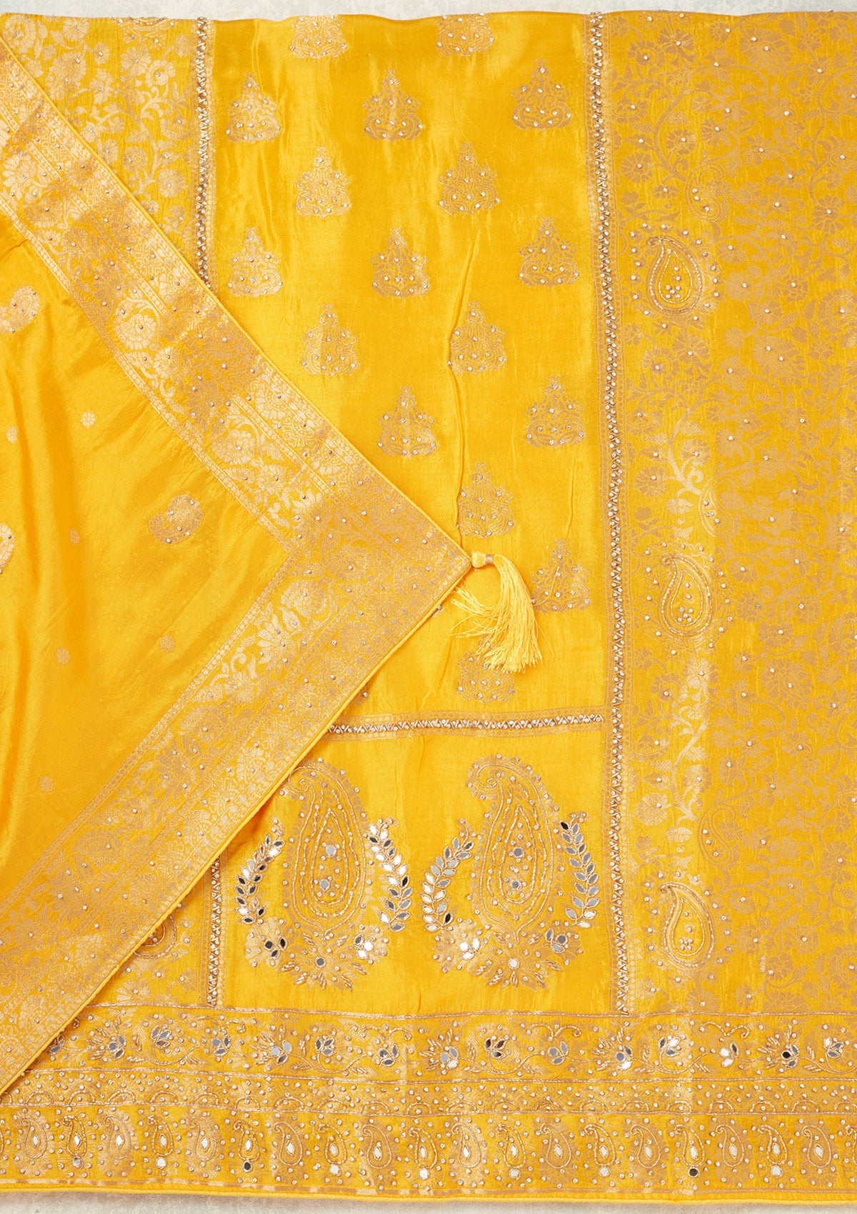 Yellow Salwar Suit in Dola Silk fabric. The Salwar Suit is embellished with Stonework (Silver) embroidery. Accompanied with a bottom and dupatta. Comes with the Koskii promise of premium quality.