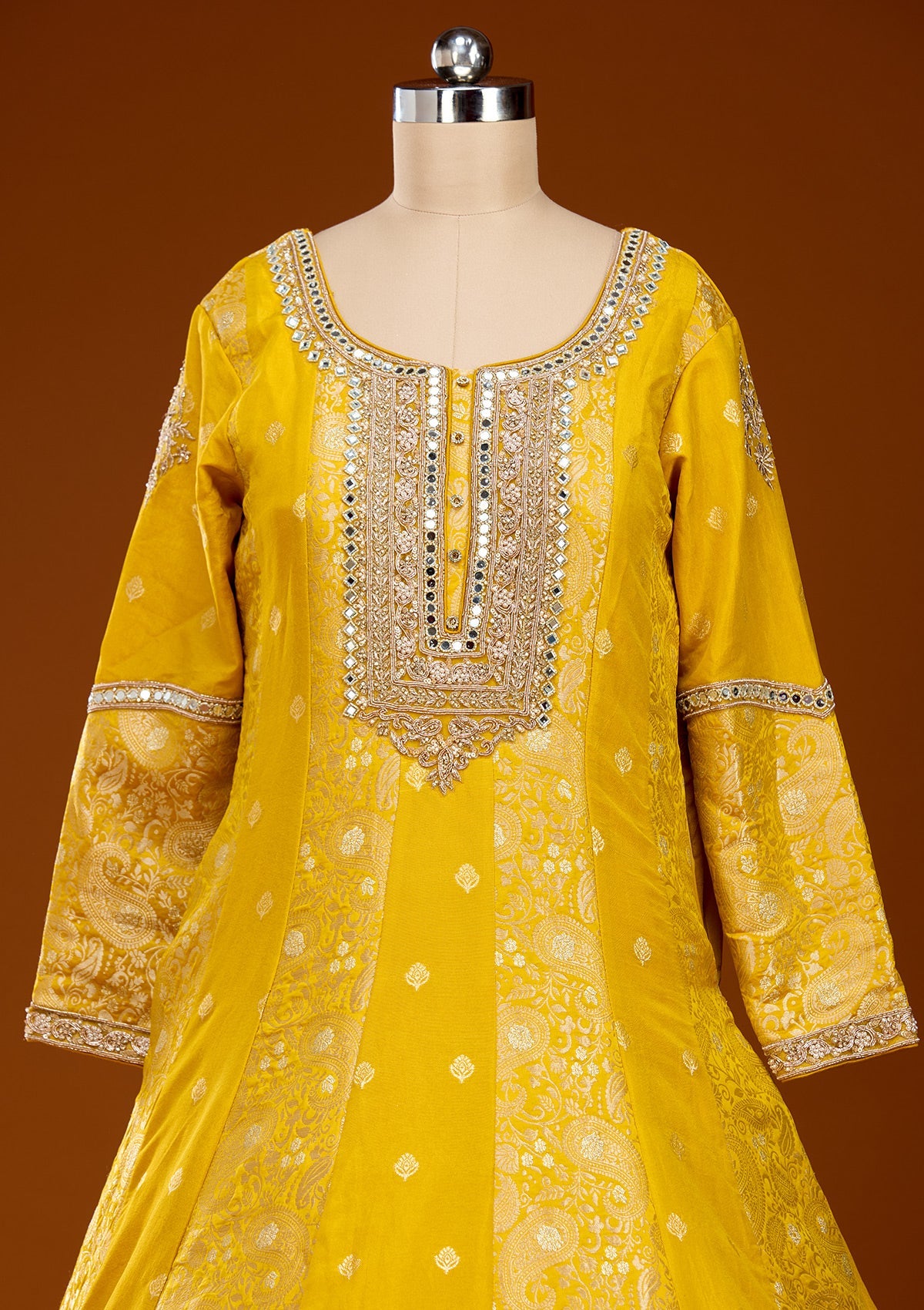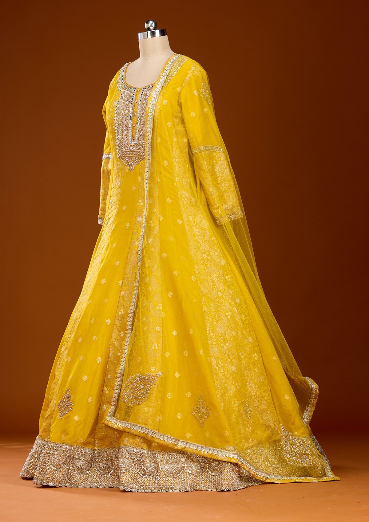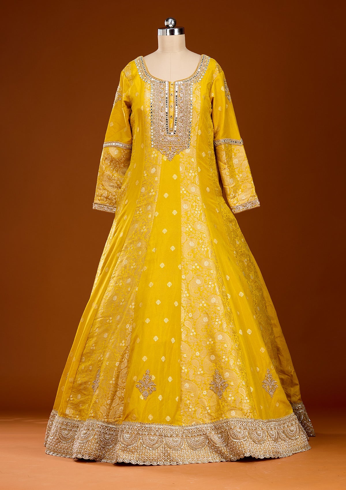 Yellow Readymade Gown in Banarasi fabric. The Gown is embellished with Zariwork embroidery. The Yellow Gown has a Round Neck. Comes with the Koskii promise of premium quality.