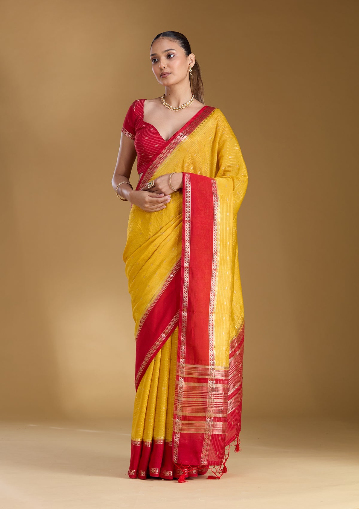 Yellow Silk_Saree in Art Silk fabric. The Silk_Saree is elevated with Zariwork (Gold) embroidery. It comes with an Unstitched blouse. Comes with the Koskii promise of premium quality.