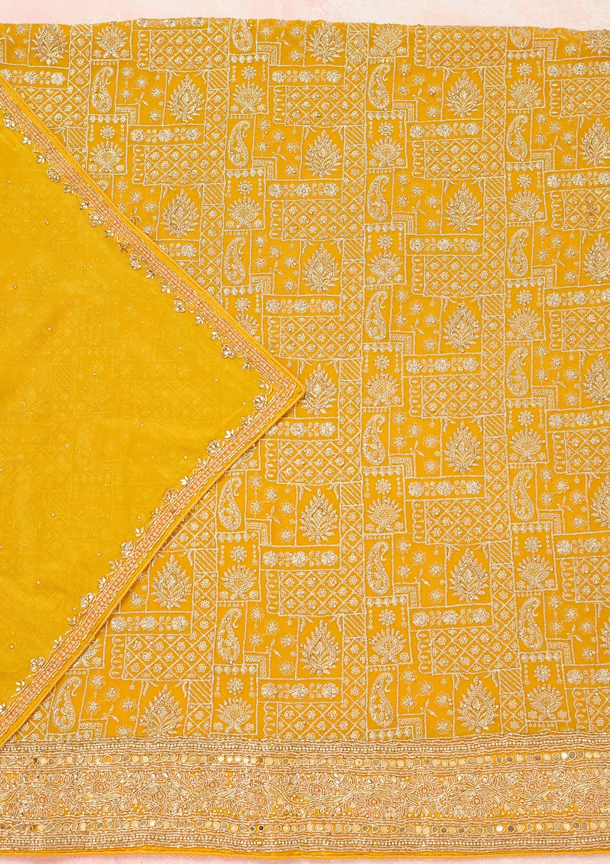 Yellow Salwar Suit in Georgette fabric. The Salwar Suit is embellished with Zariwork (Gold) embroidery. Accompanied with a bottom and dupatta. Comes with the Koskii promise of premium quality.