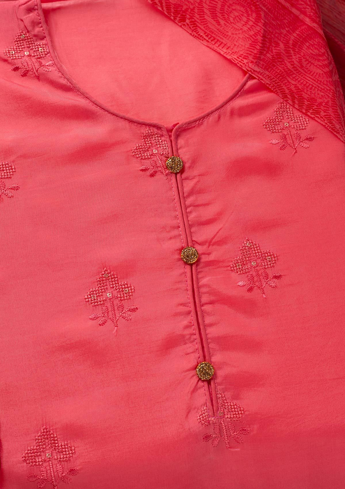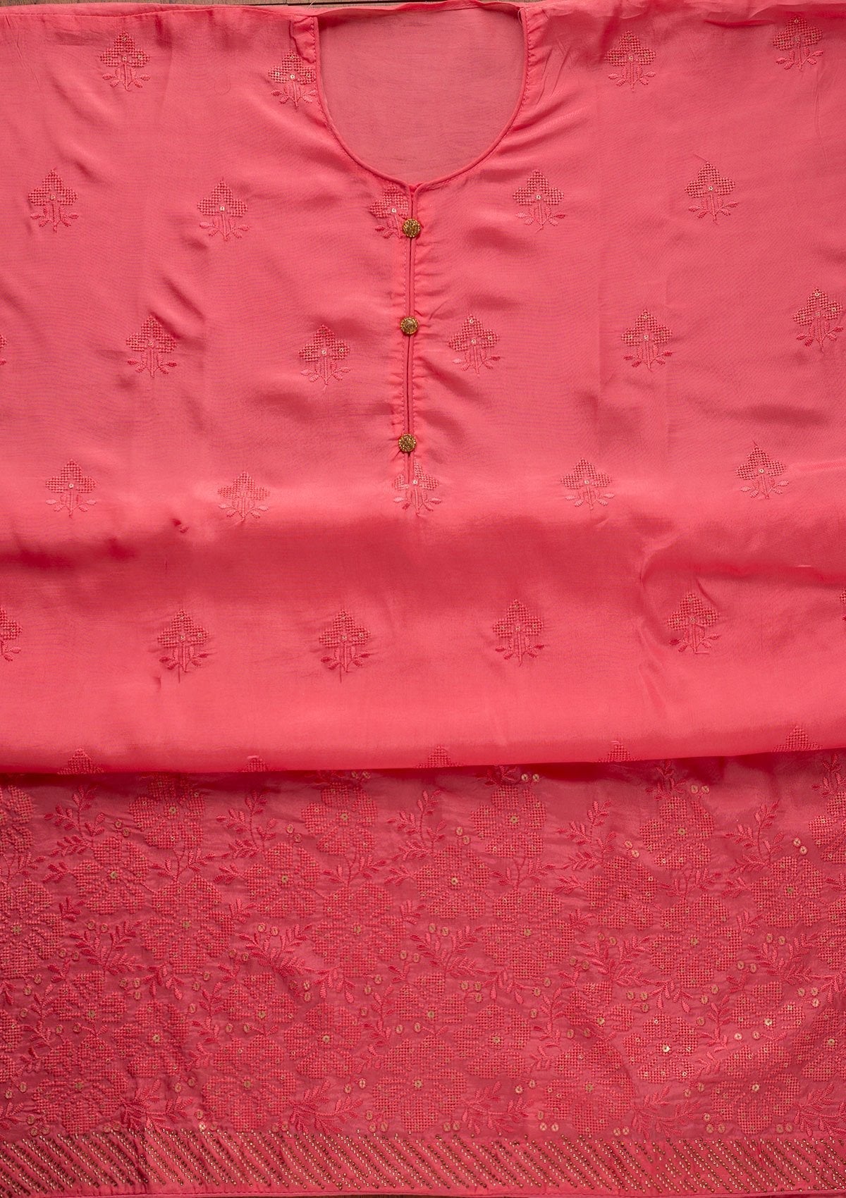 Peach Salwar Suit In Satin Fabric. The Salwar Suit Is Embellished With Swarovski stone work. Accompanied with an unstitched bottom and dupatta. Comes With The Koskii Promise Of Premium Quality.