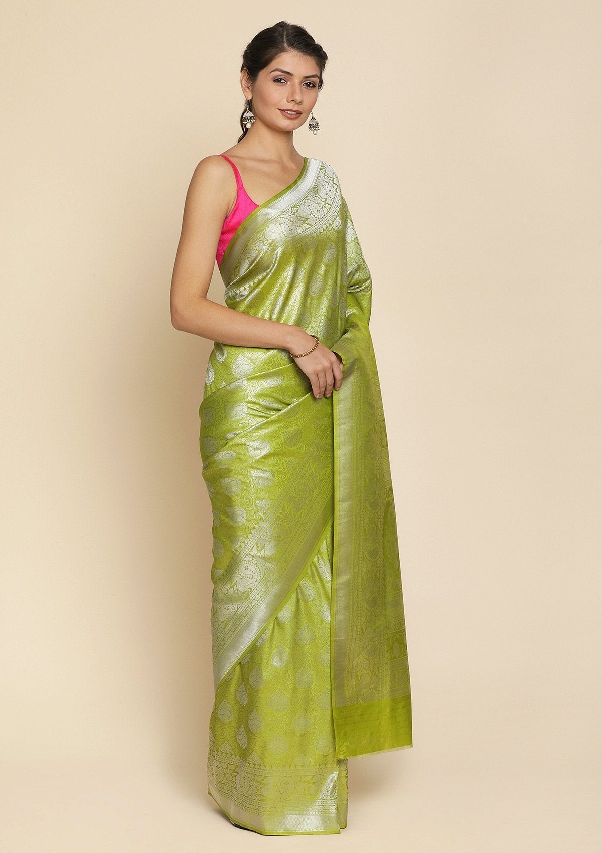 Pista Green Saree In Raw Silk. The Saree Is Embellished With Subtle Embroidery. Paired With A Matching Unstitched Blouse. Comes With The Koskii Promise Of Superior Quality.