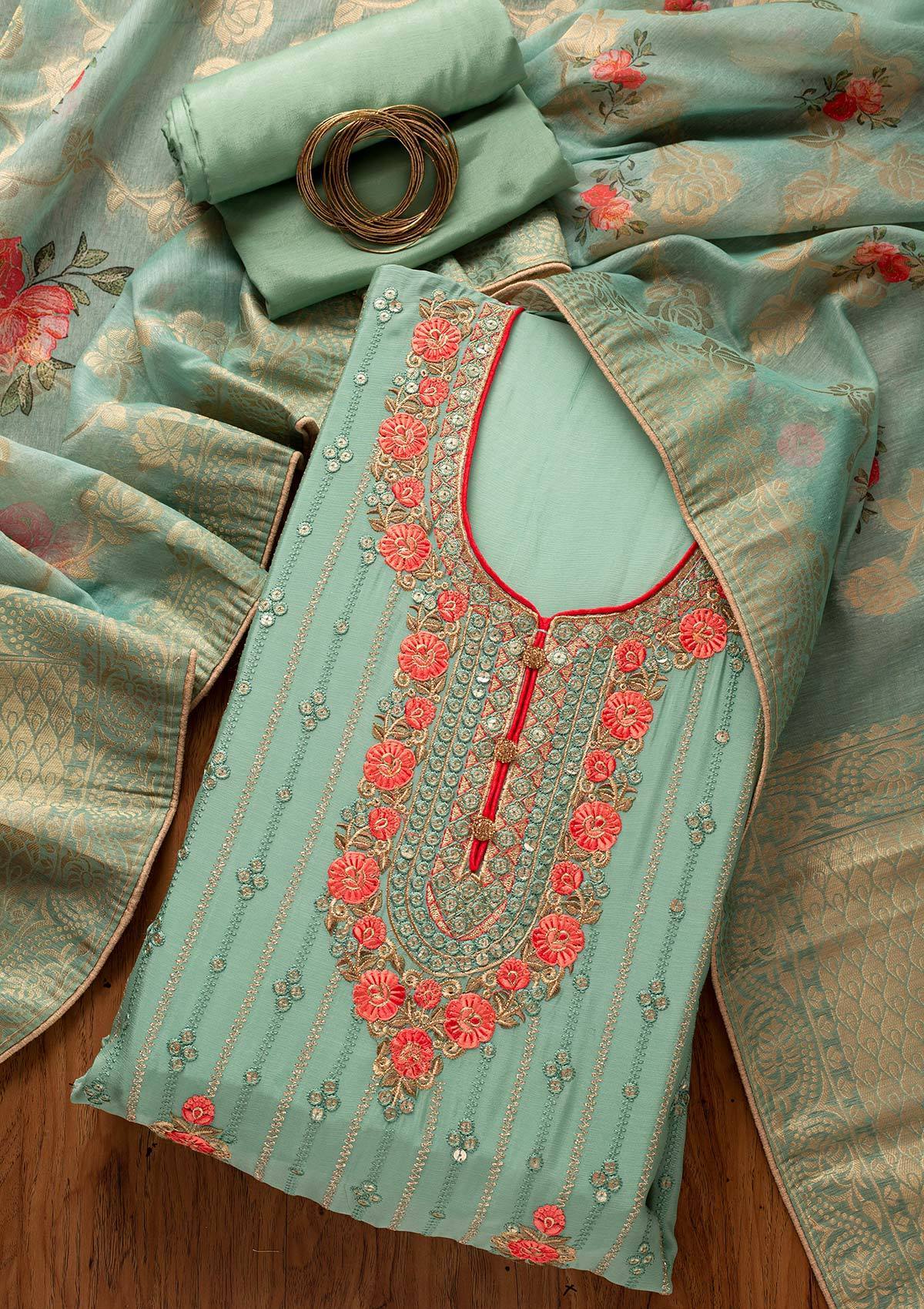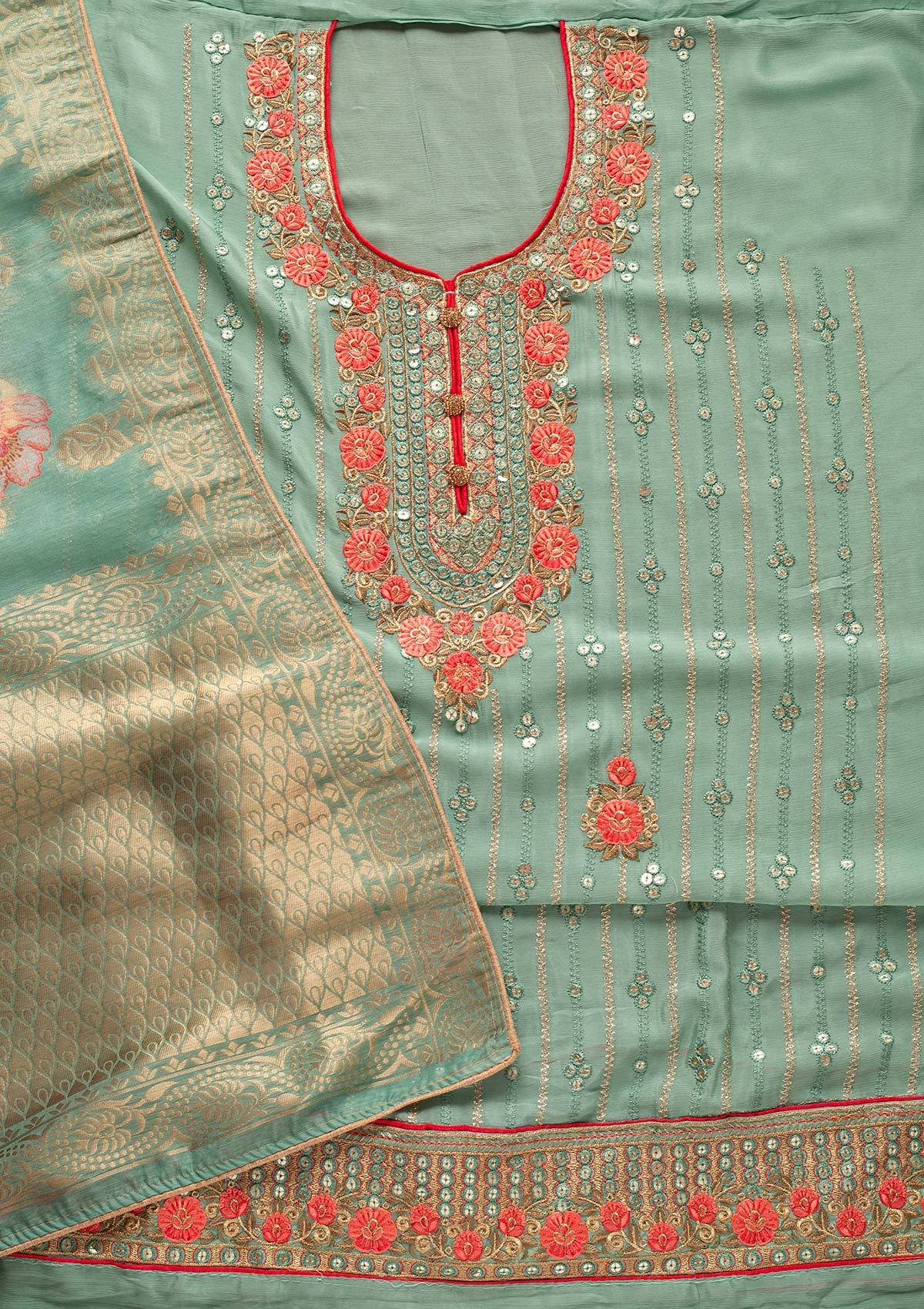 Pista Green Sequins Semi Crepe Designer Unstitched Salwar Suit - koskii