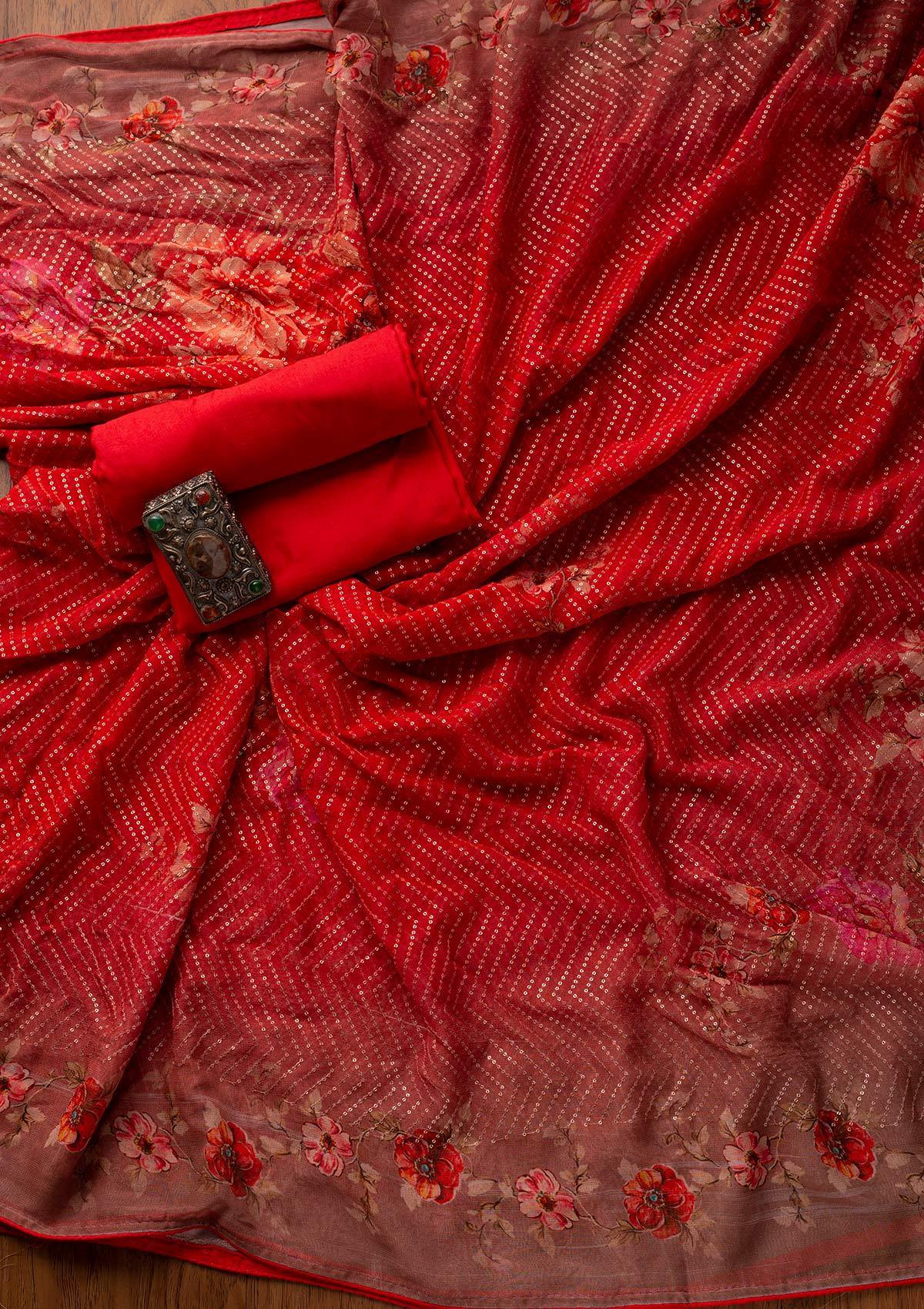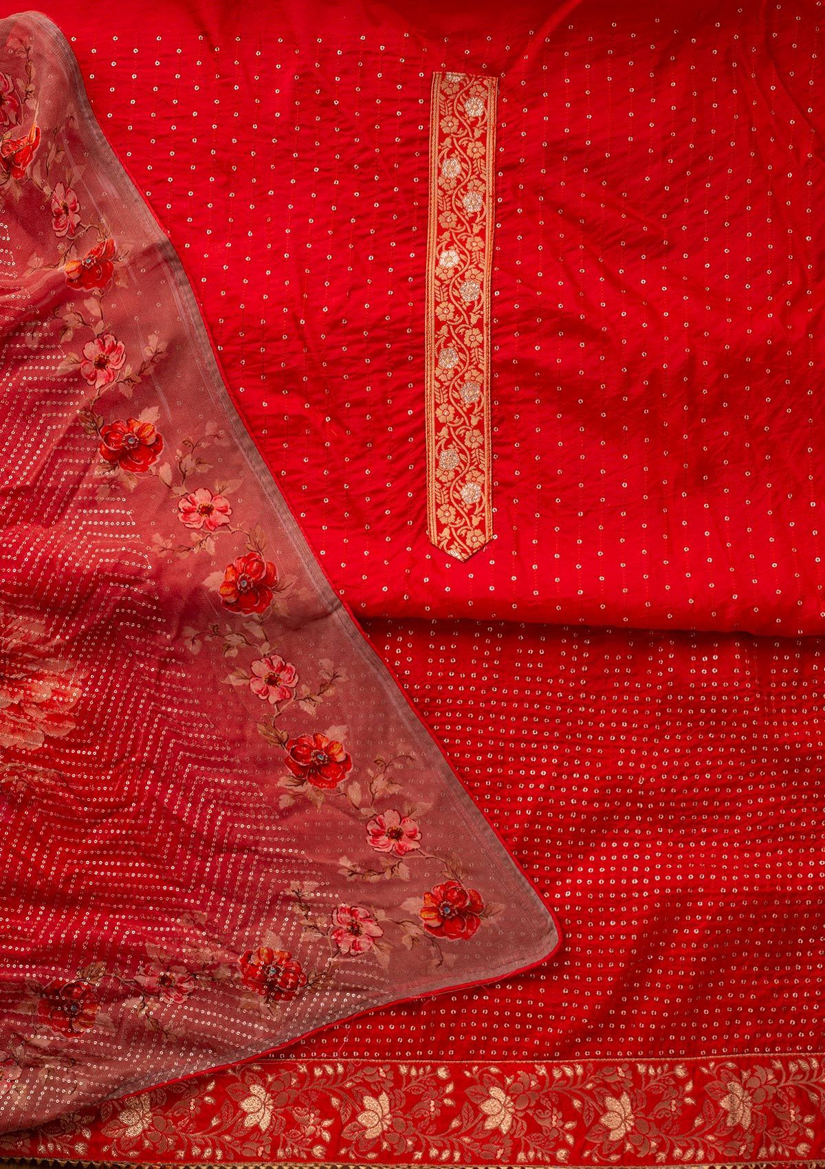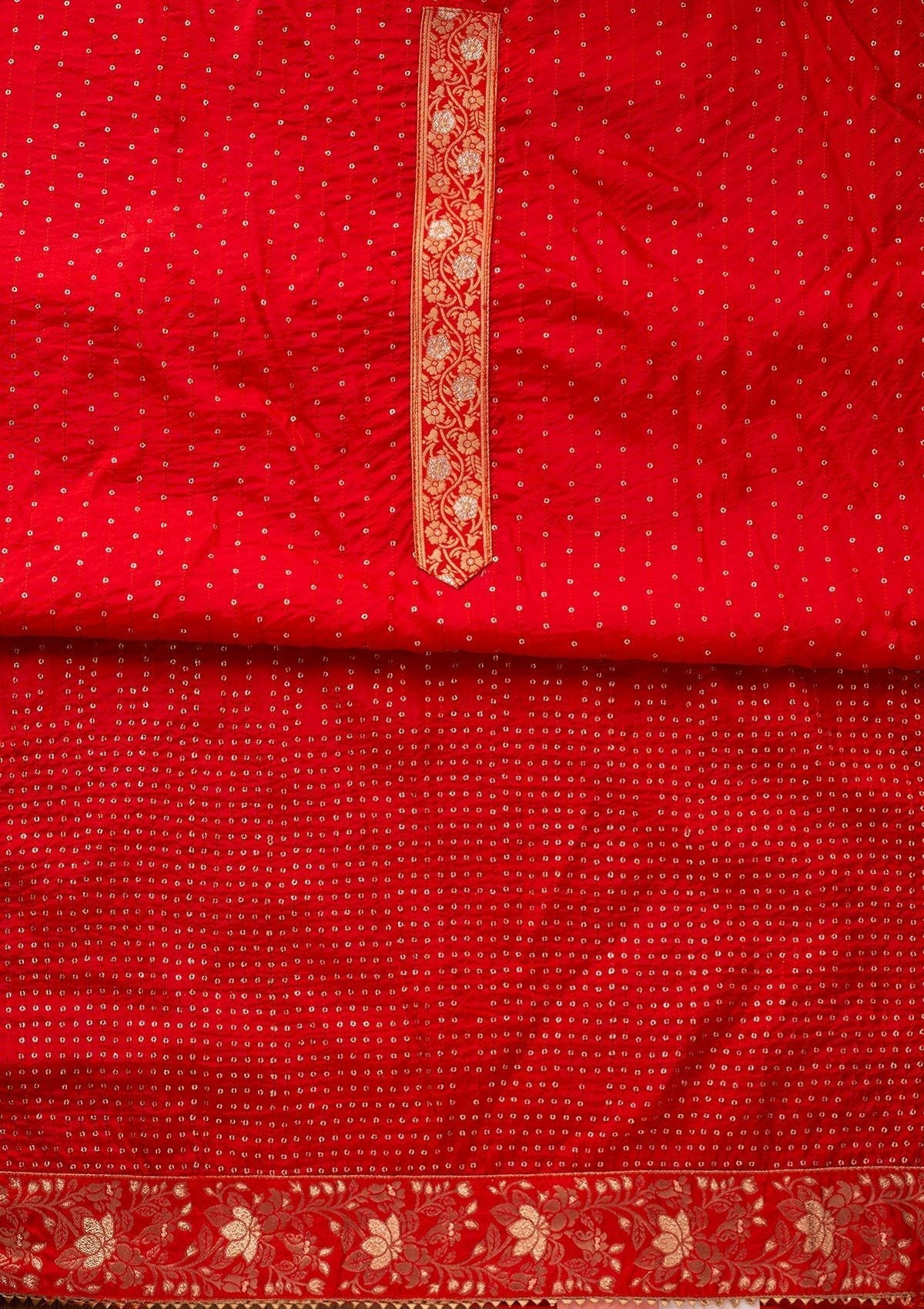 Red Salwar Suit In Satin Fabric. The Salwar Suit Is Embellished With Sequins Embroidery. Accompanied with an unstitched bottom and dupatta. Comes With The Koskii Promise Of Premium Quality.